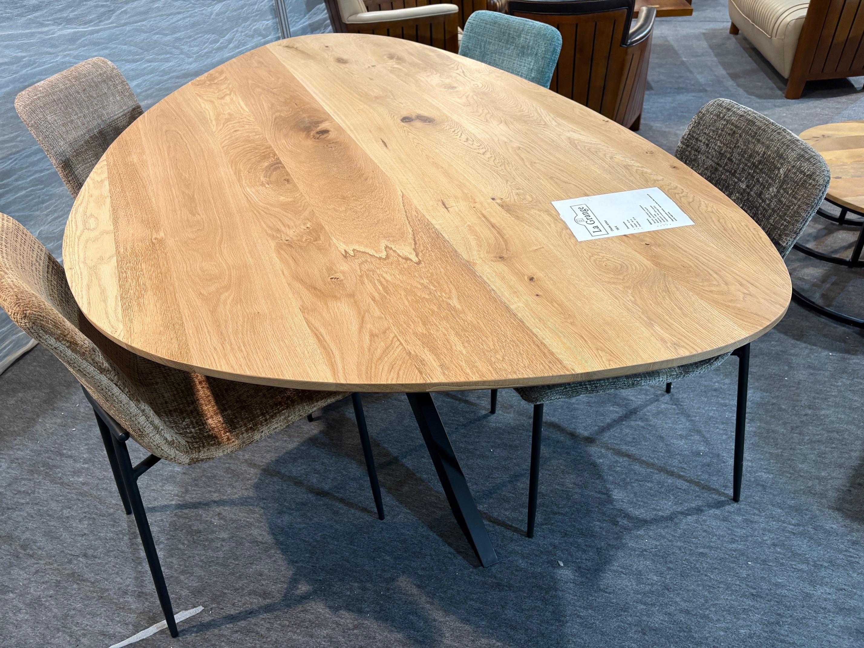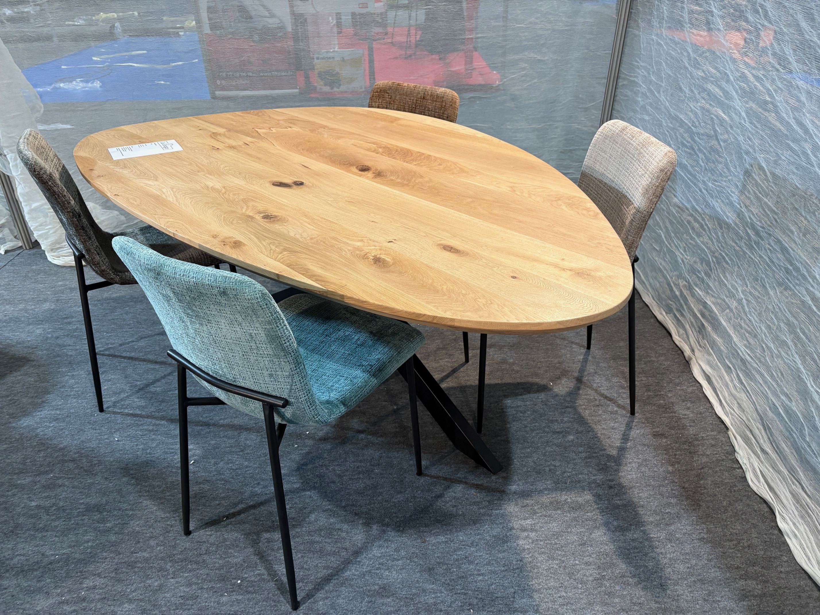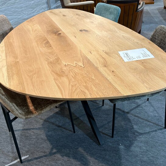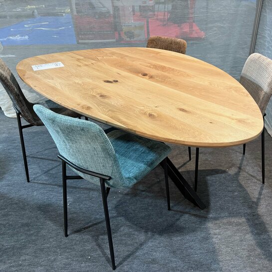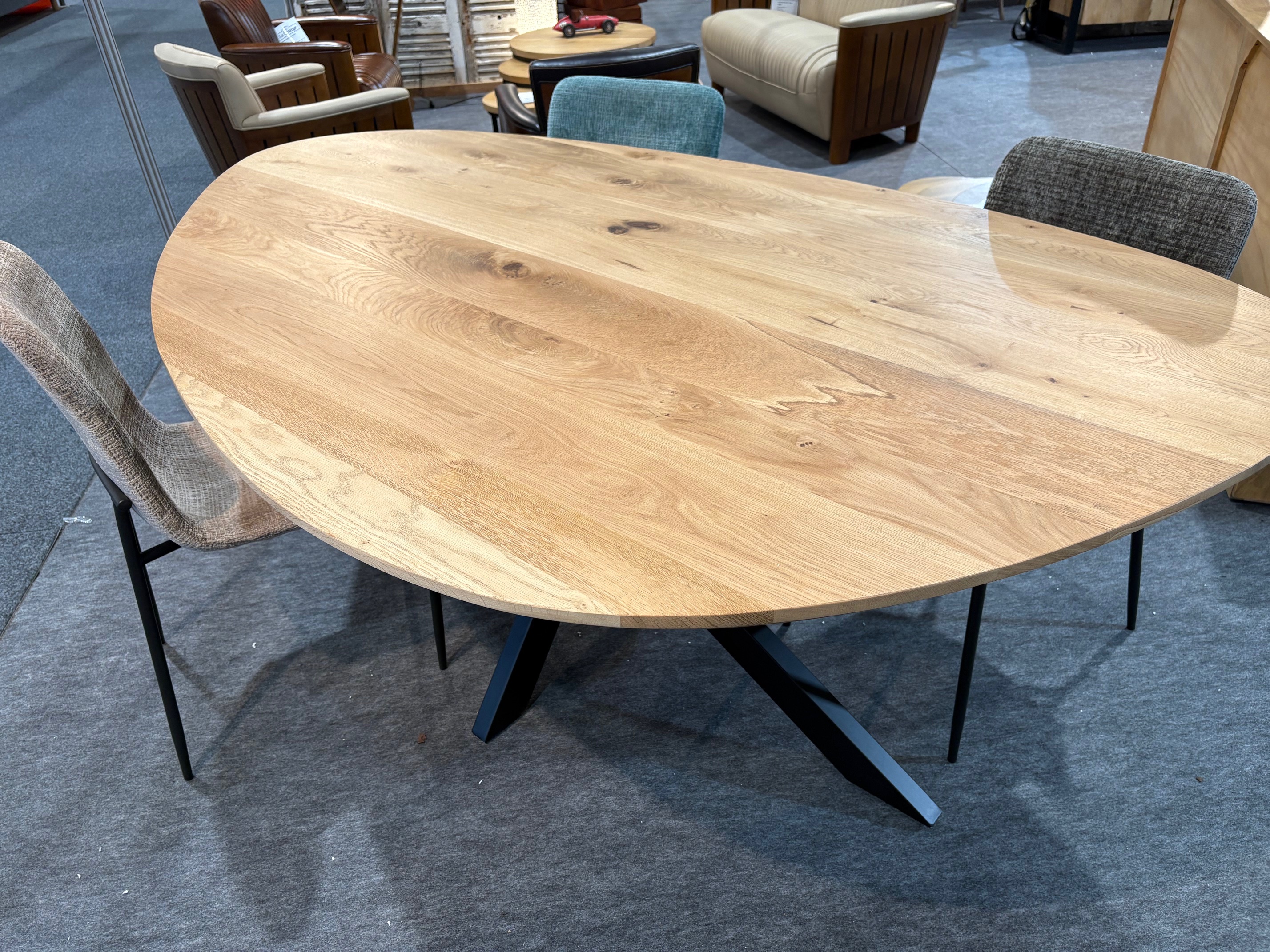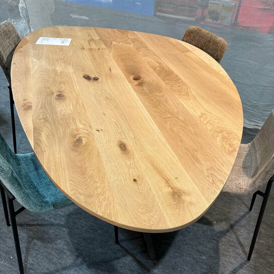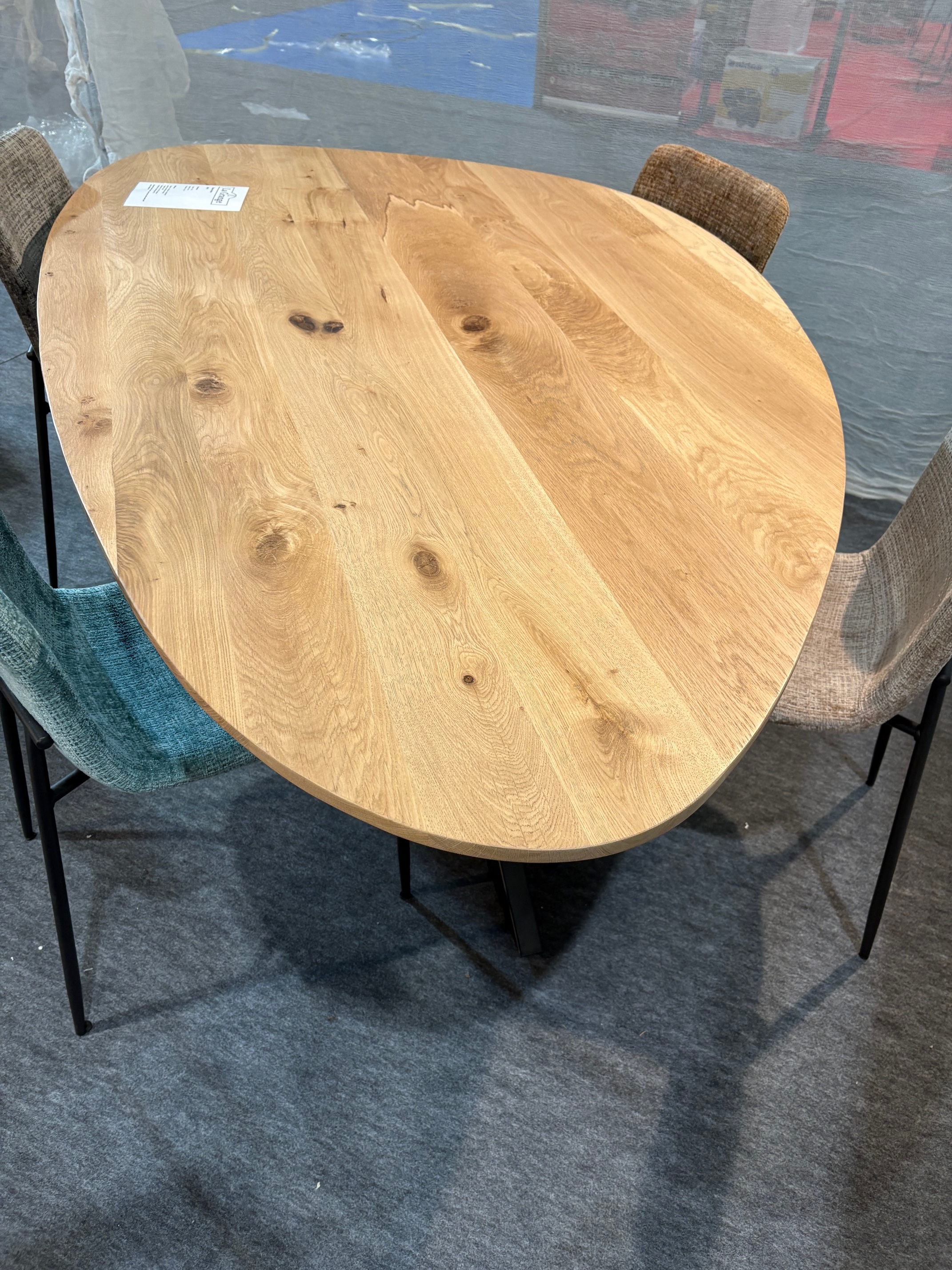 Son plateau en chêne massif de 45 mm d’épaisseur, en forme de goutte d’eau, apporte chaleur et douceur, tandis que son piètement mikado en acier laqué noir assure stabilité et caractère contemporain.