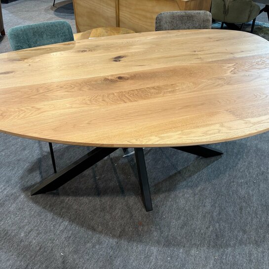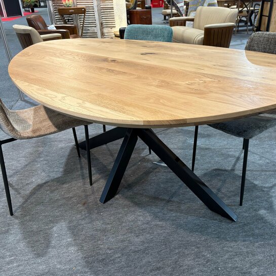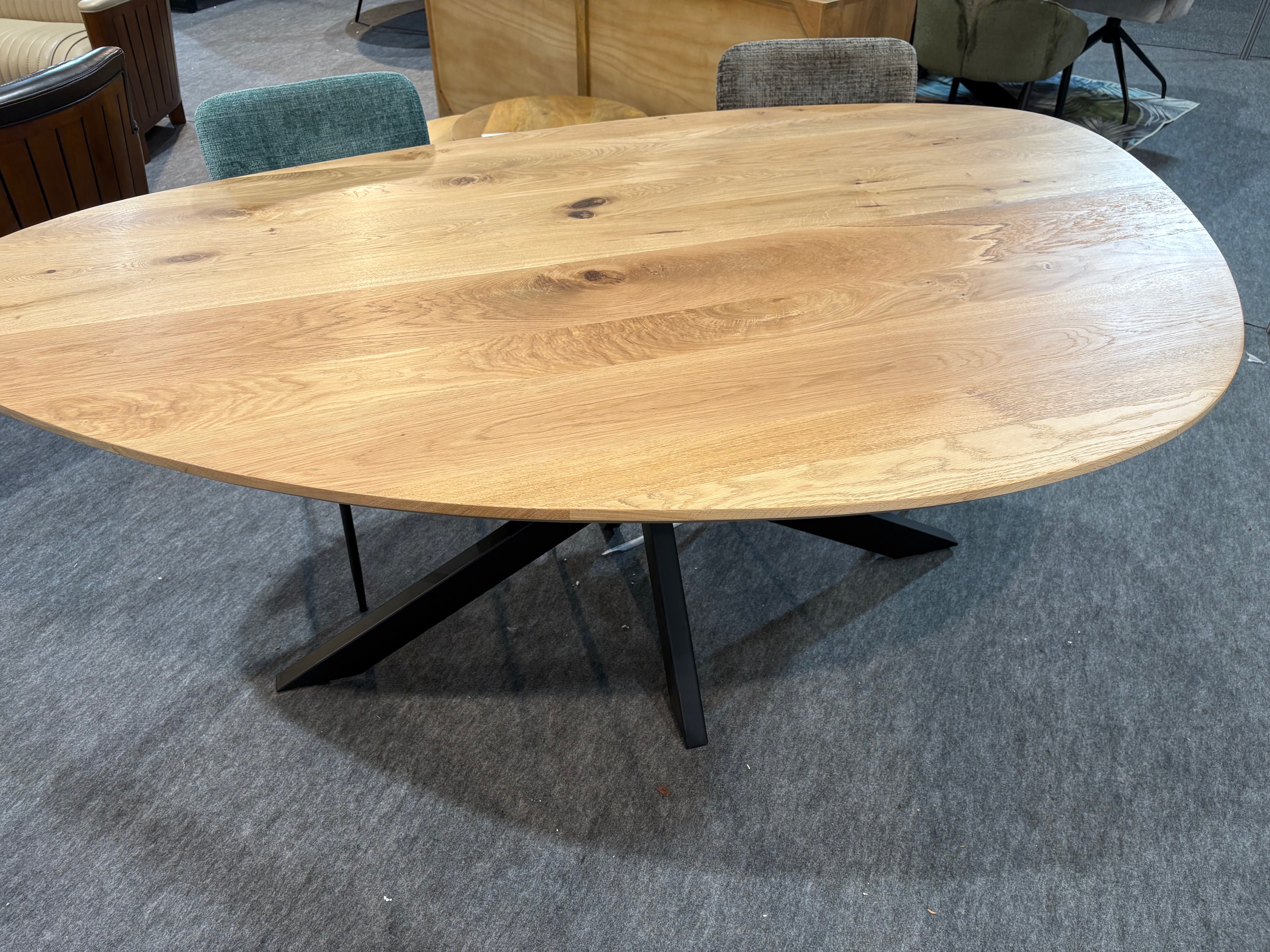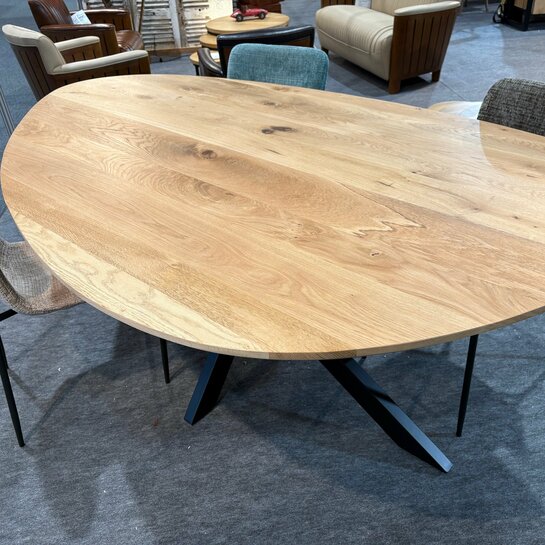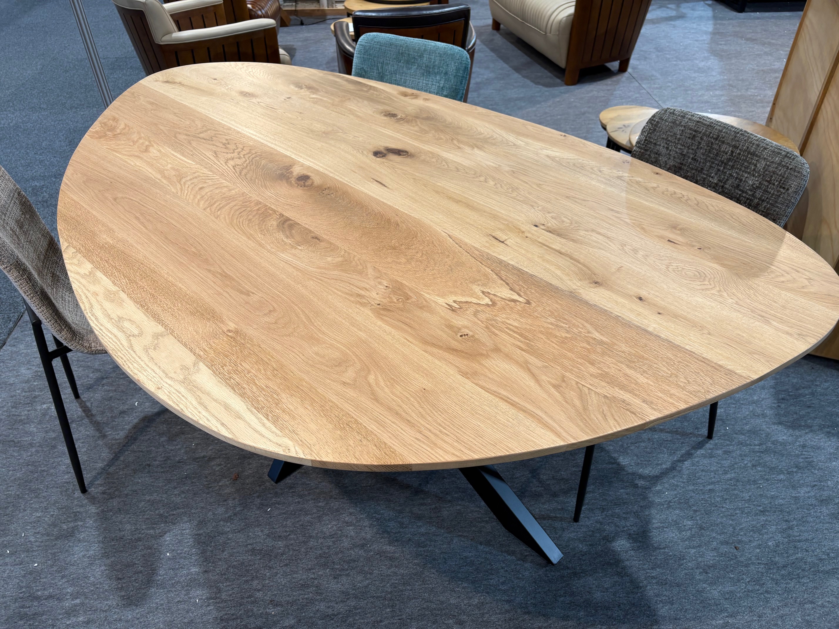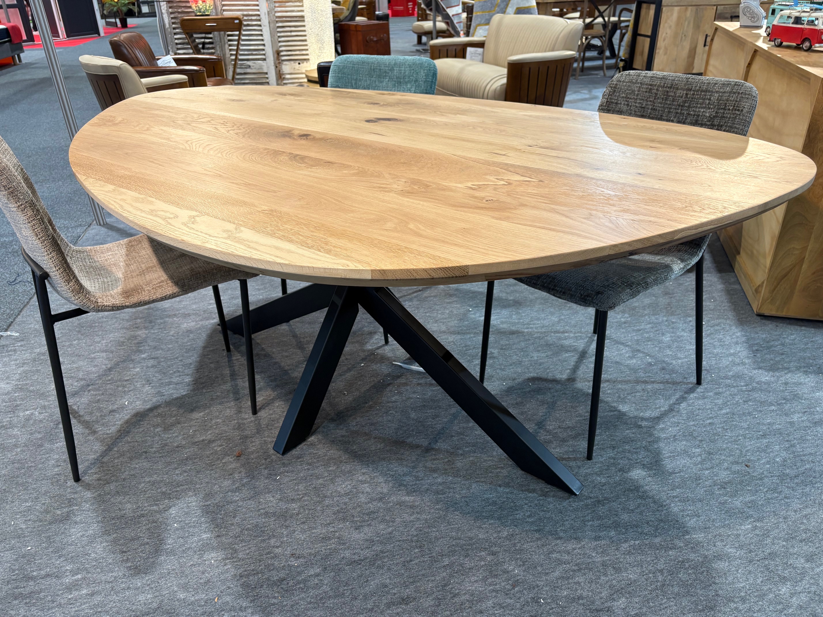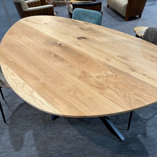 Son plateau en chêne massif de 45 mm d’épaisseur, en forme de goutte d’eau, apporte chaleur et douceur, tandis que son piètement mikado en acier laqué noir assure stabilité et caractère contemporain.