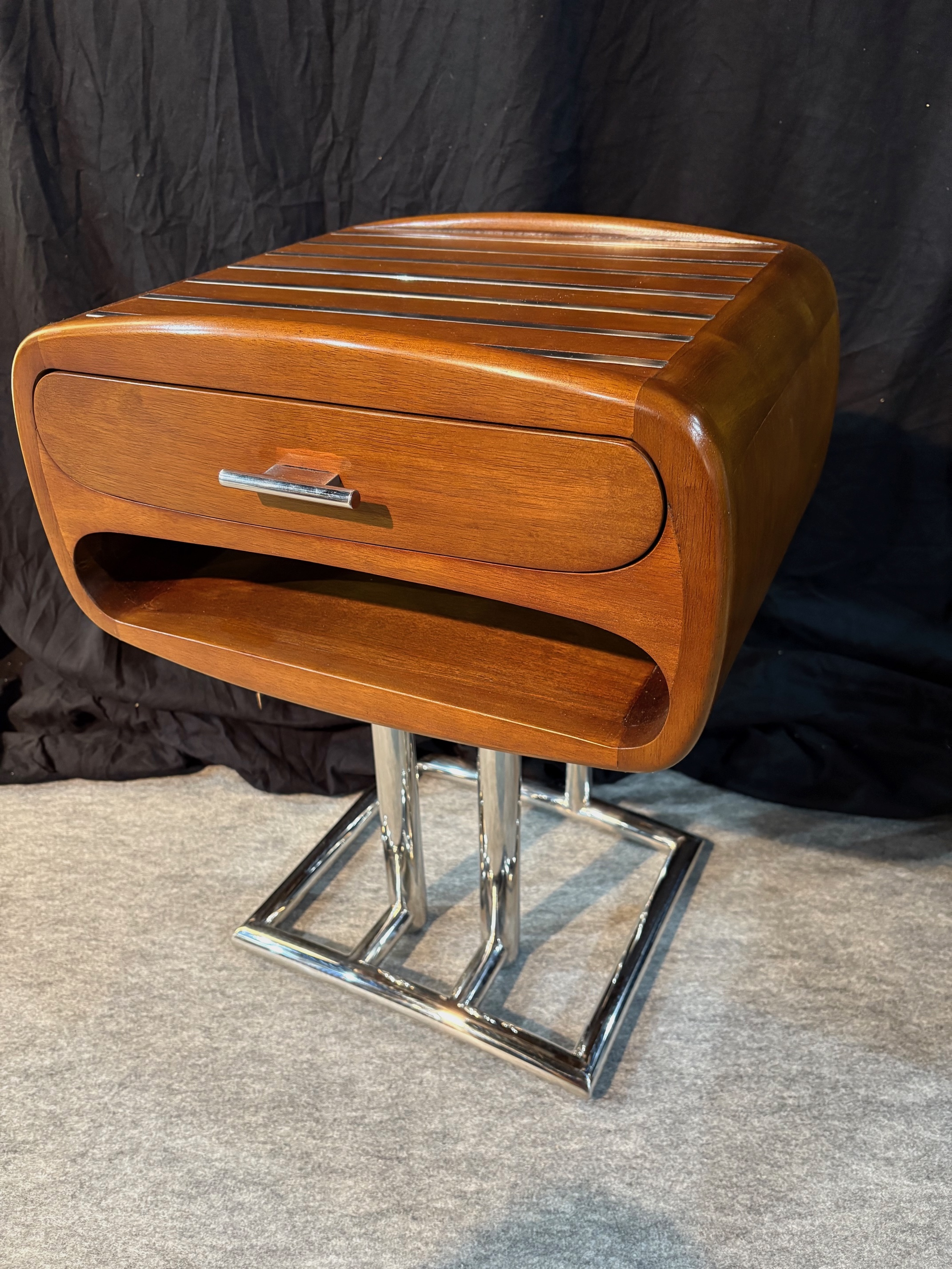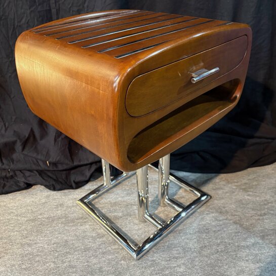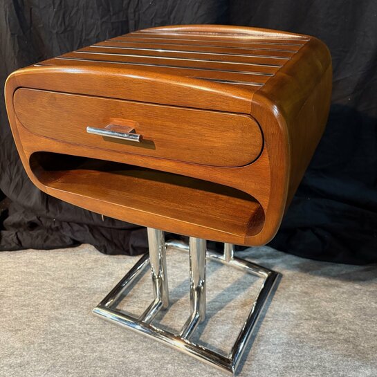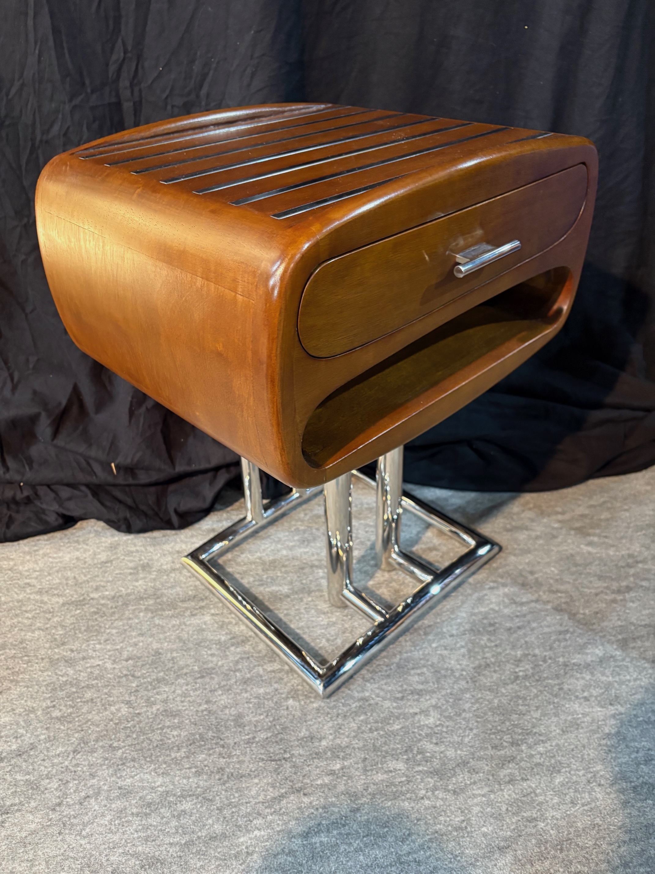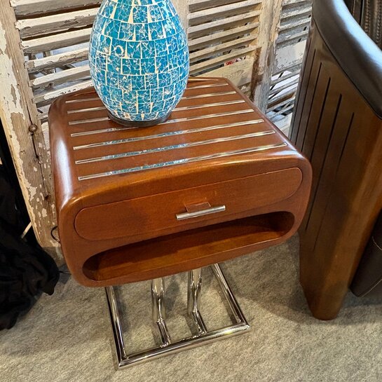 Bout de canapé rétro en inox et bois (hévéa massif), esprit marin et bord de mer.