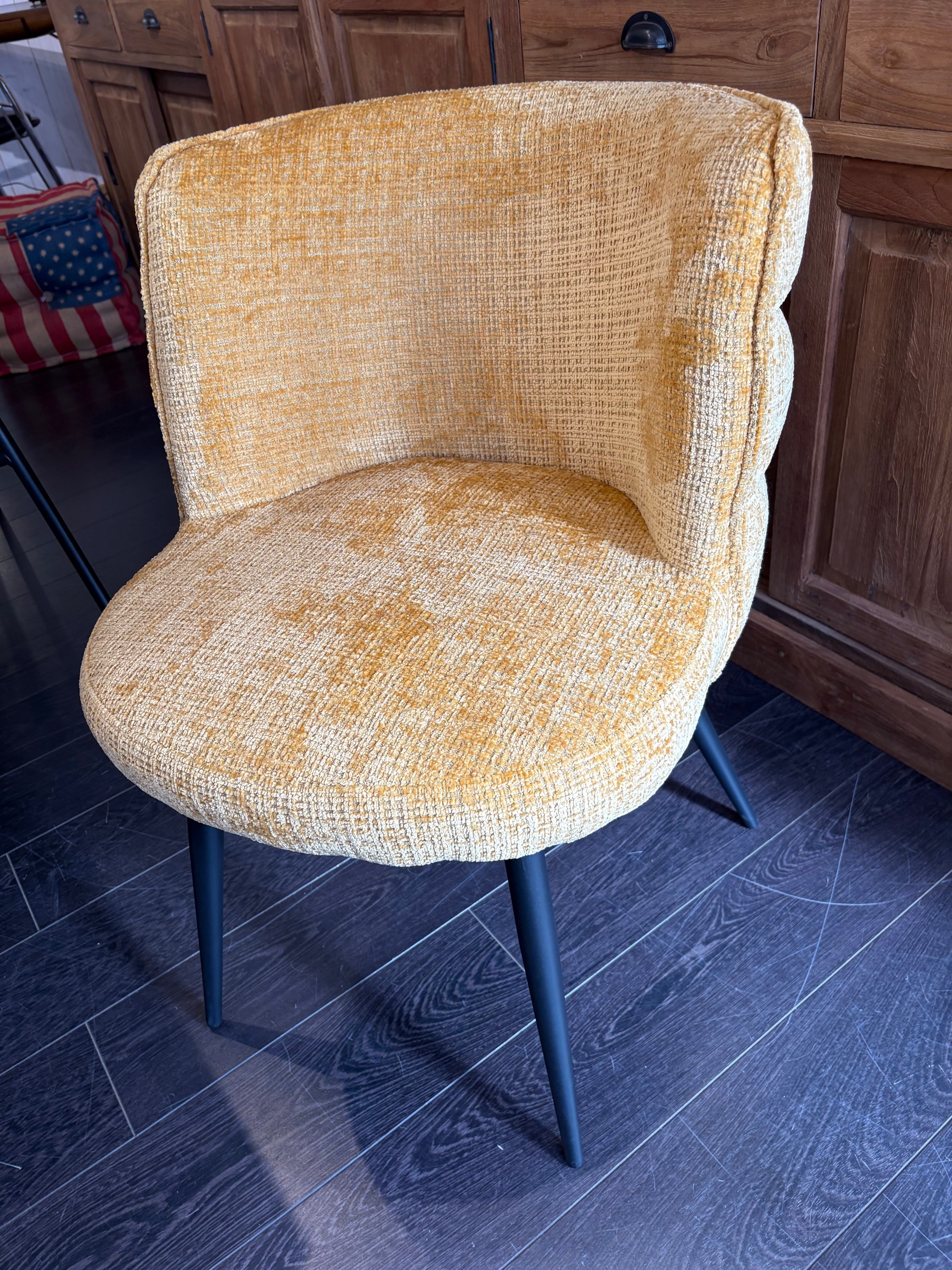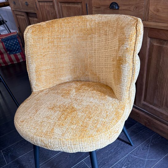 Fauteuil-chaise Arthur jaune 240 € Structure : métal laqué + contreplaqué Mousse : polyuréthane 28 kg/m3 Piètement : métal Revêtement : tissu 100% polyester Ce fauteuil existe aussi en gris taupe. Dimensions : Largeur : 57 cm Hauteur : 76 cm Profondeur : 65 cm