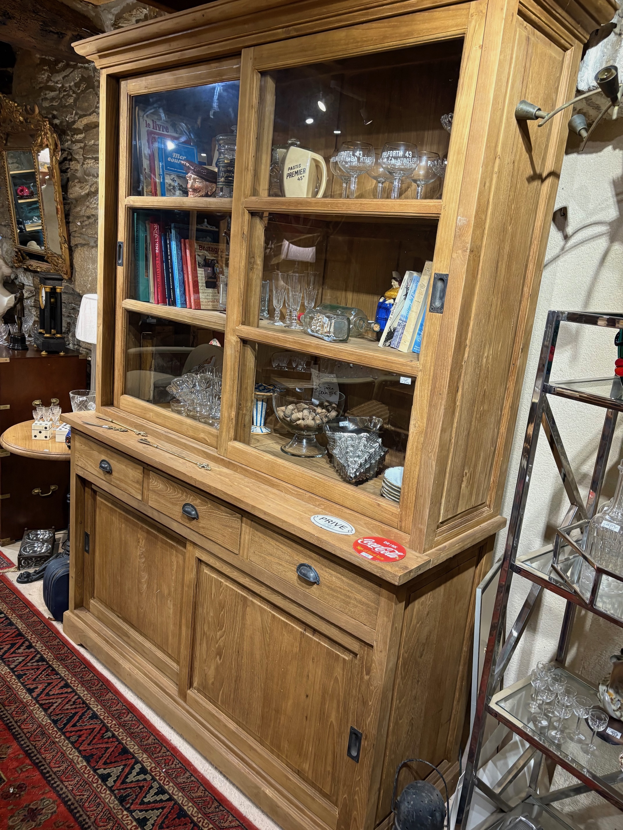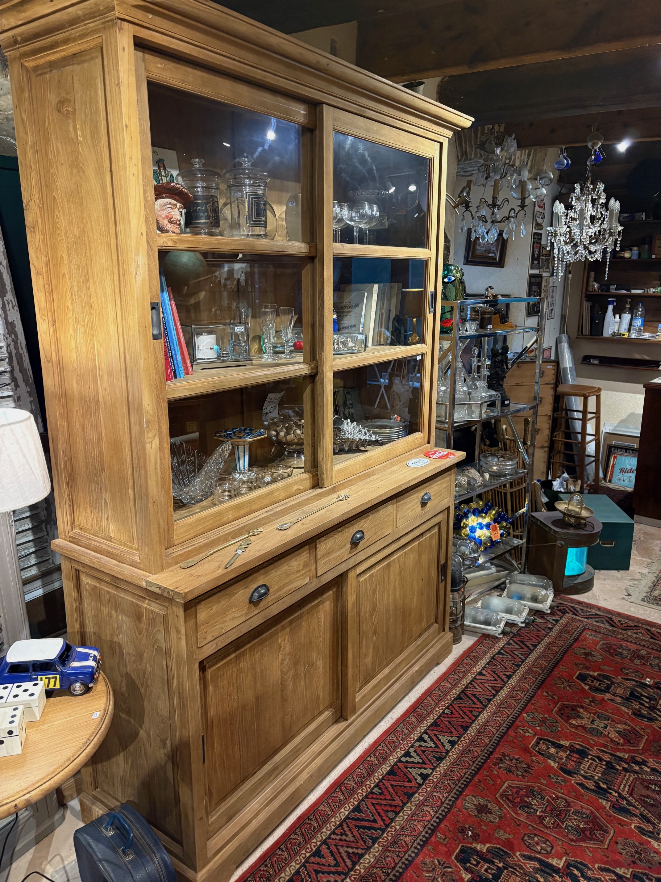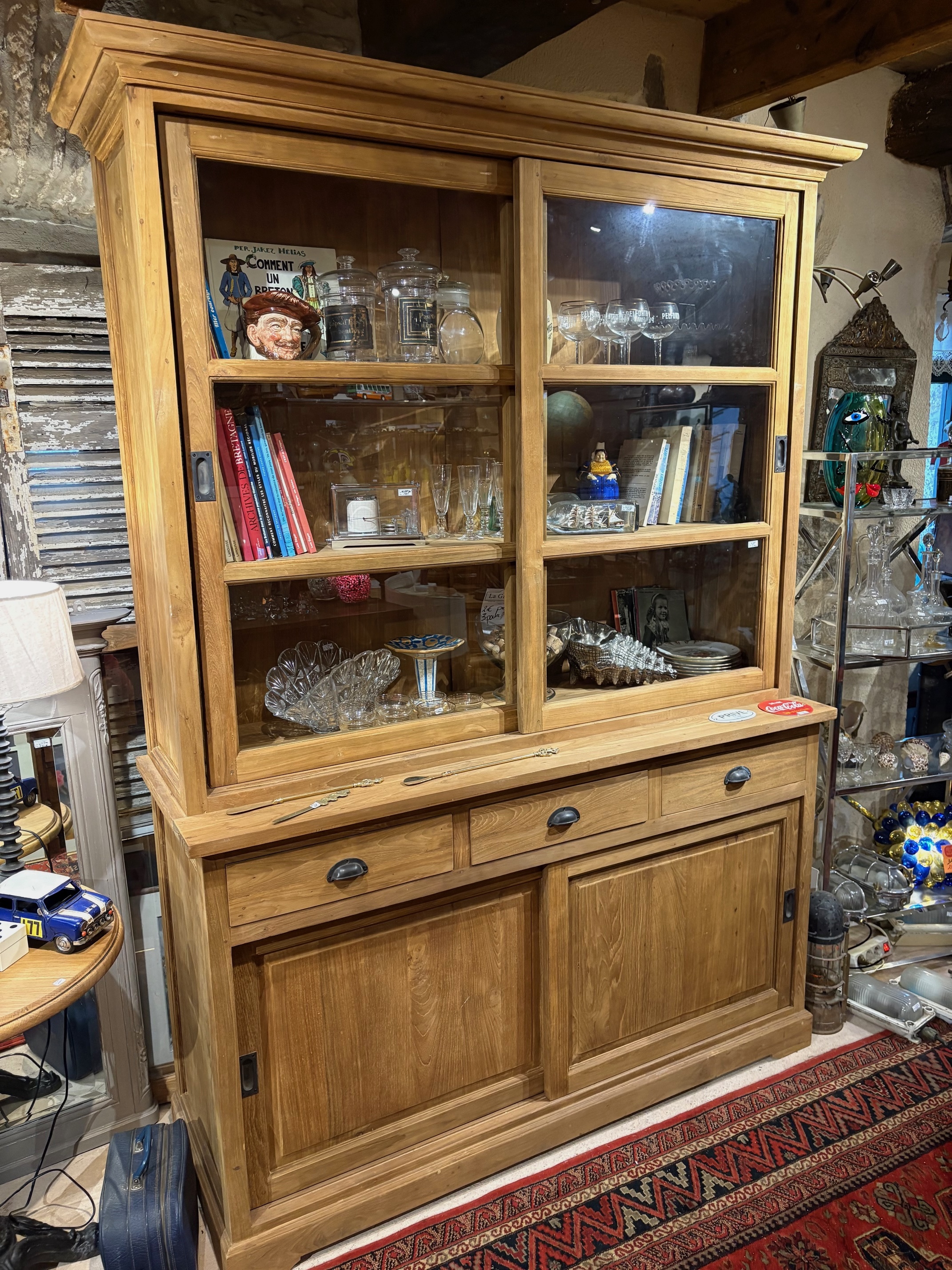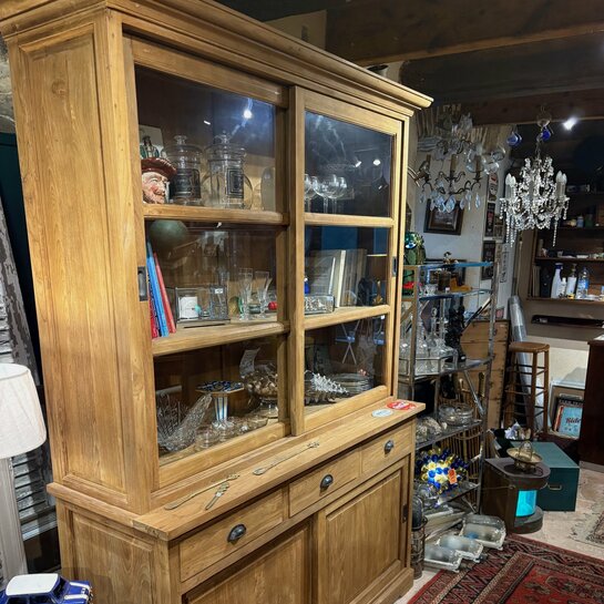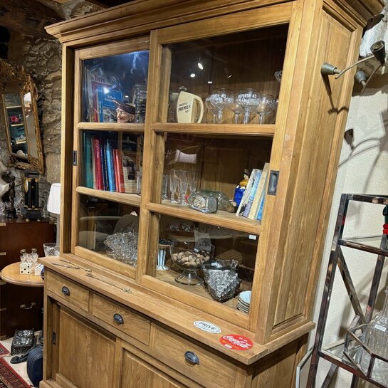 Bibliothèque en teck massif avec vitrine à portes coulissantes en verre et buffet bas doté de trois tiroirs et deux portes coulissantes.