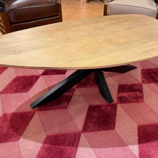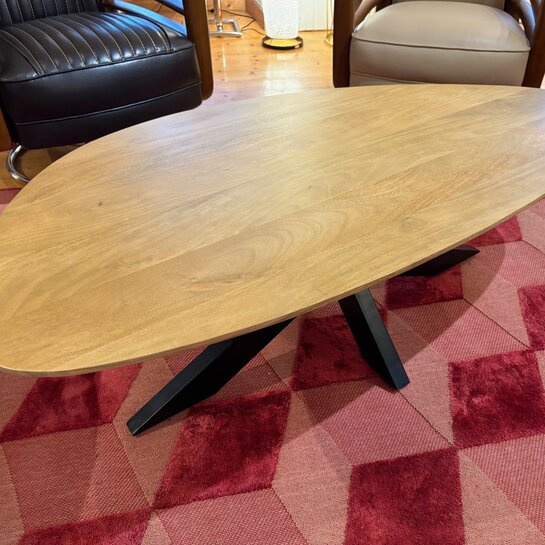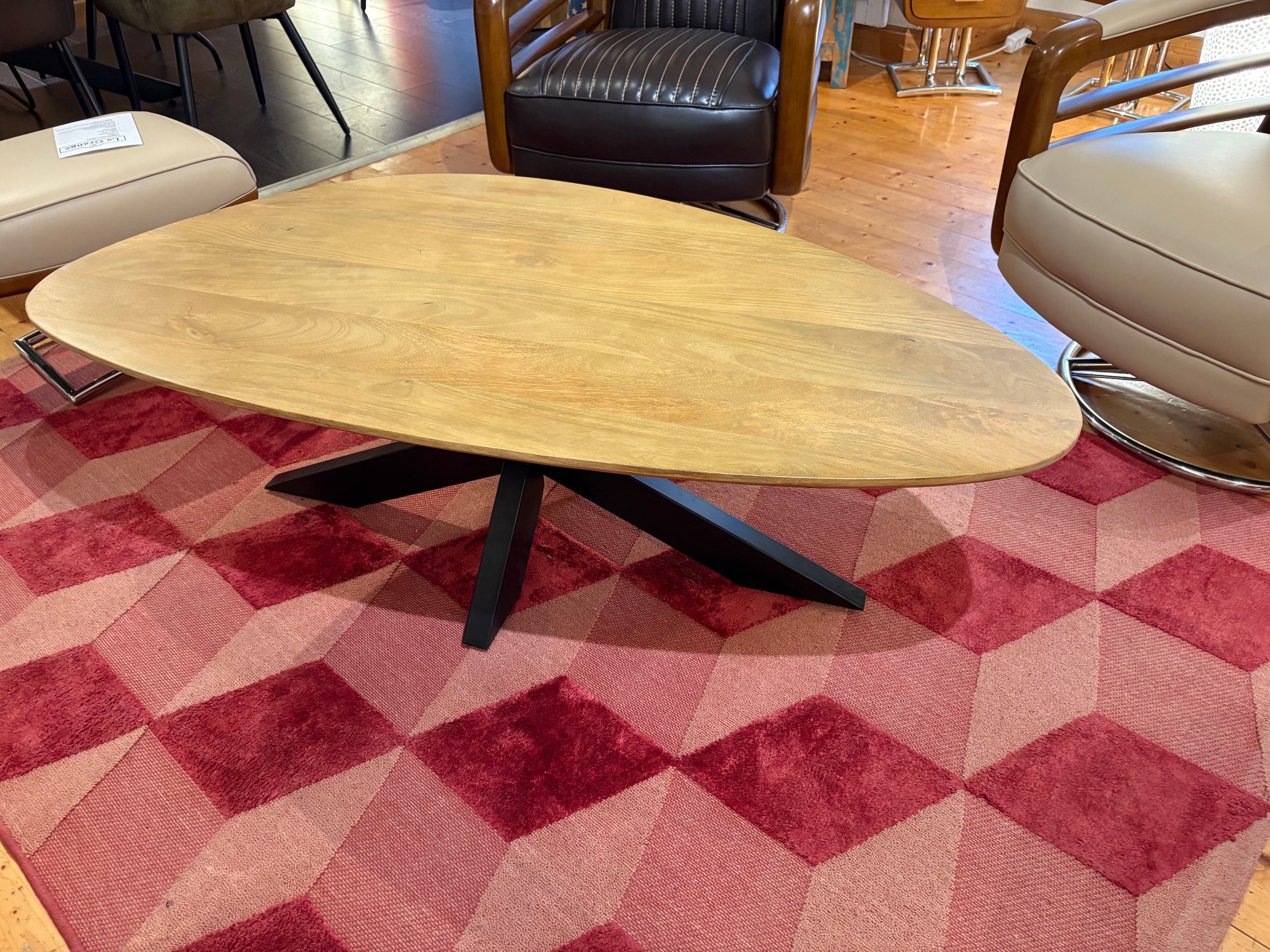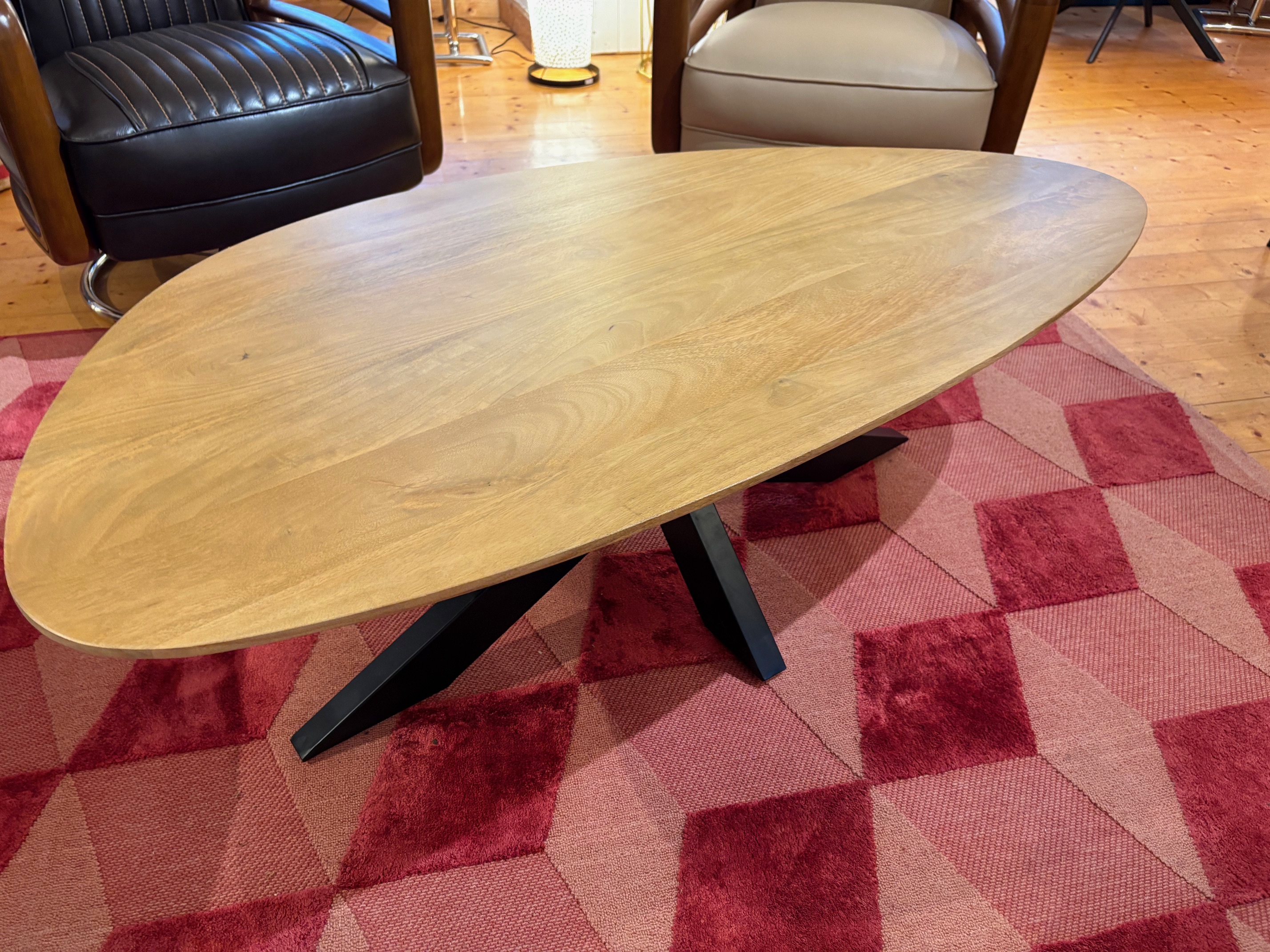 Table d’esprit scandinave avec un piètement mikado en acier, laqué, noir et son plateau en forme d’œuf en manguier massif (épaisseur 30 mm).