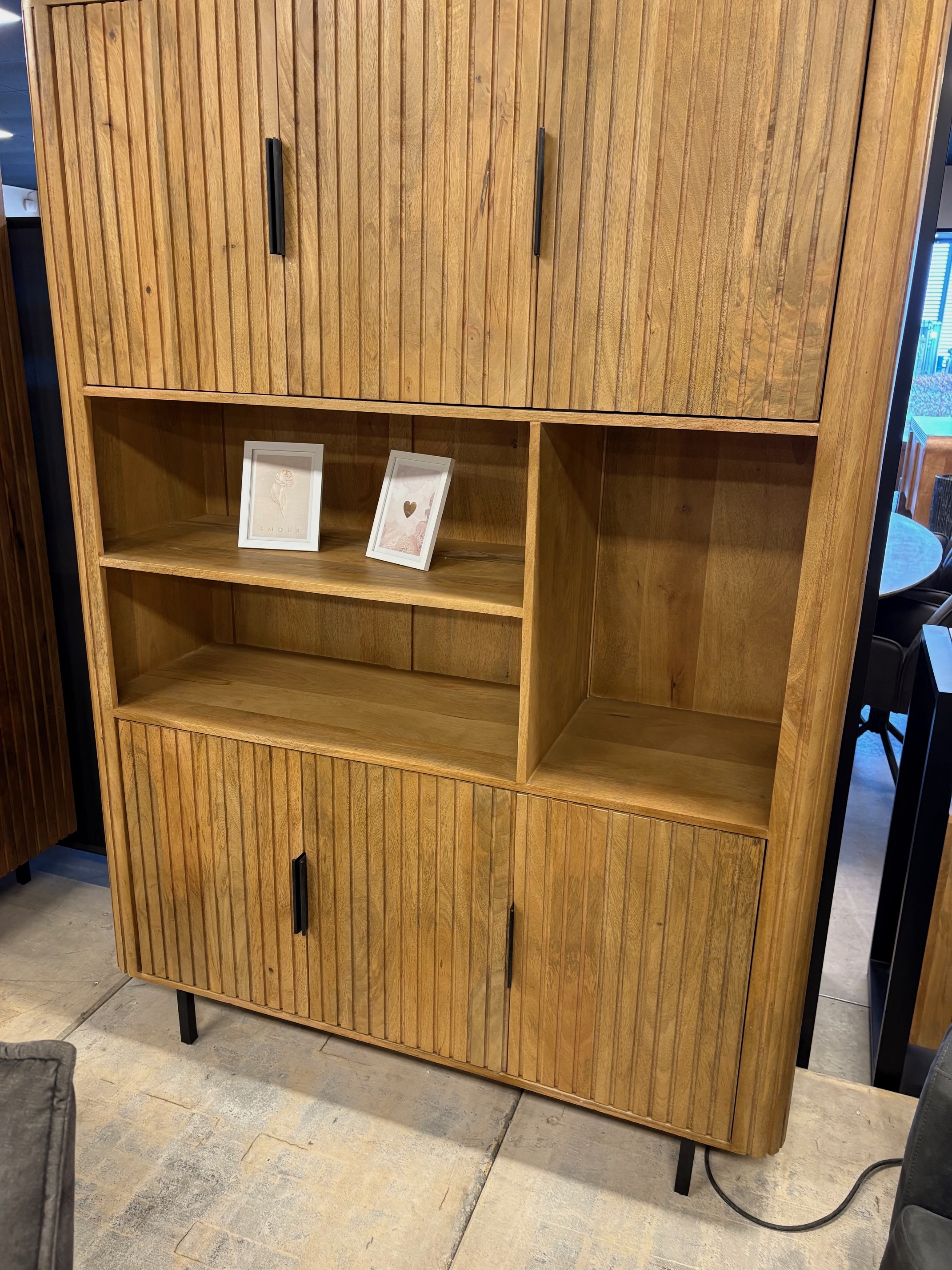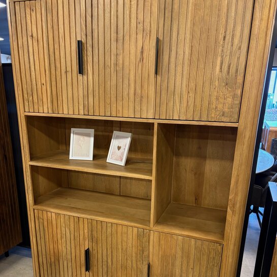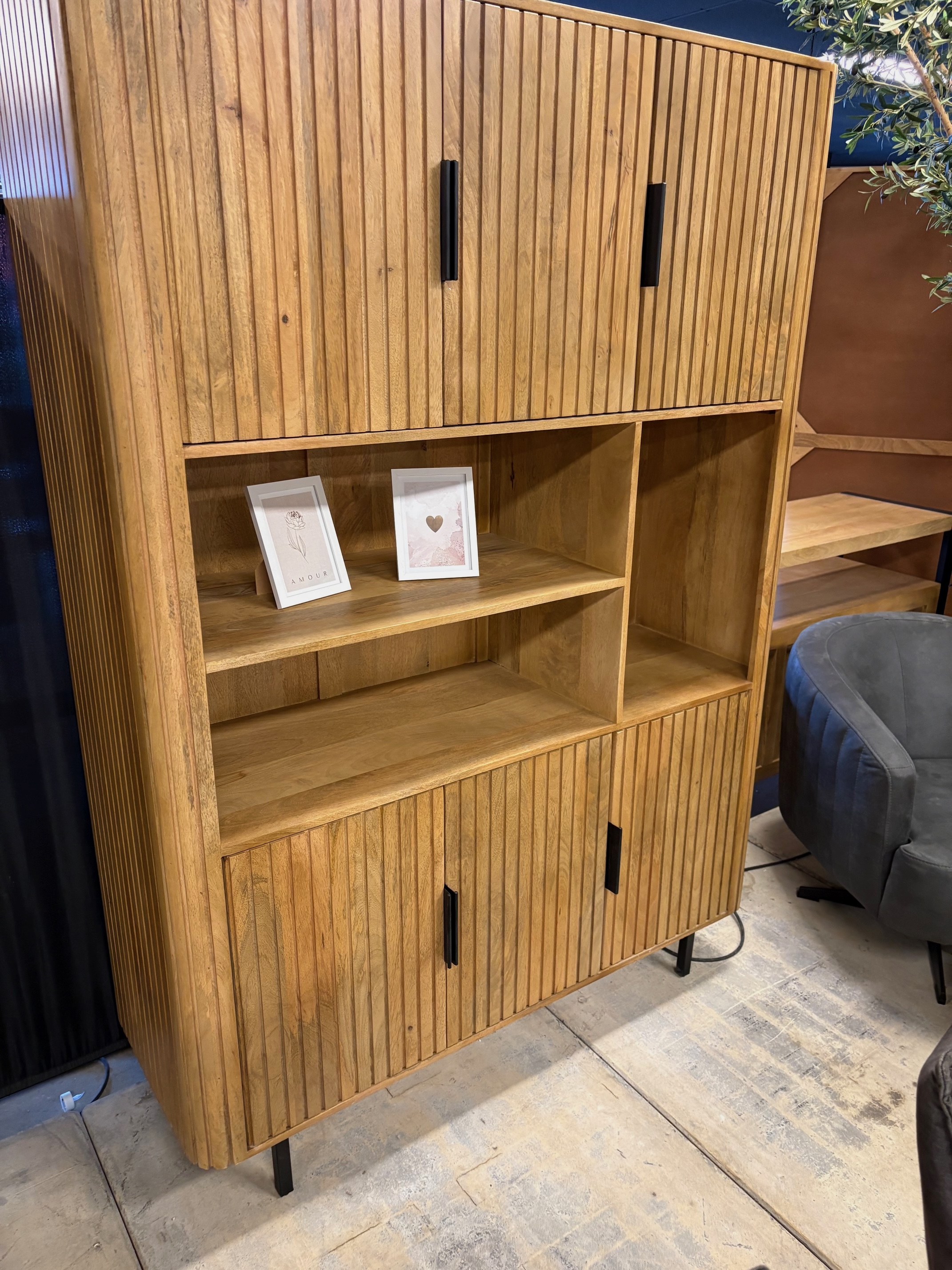 L’armoire-buffet Manon en manguier massif associe design contemporain et chaleur naturelle. Ses portes rainurées, ses détails en métal noir et ses niches ouvertes offrent un rangement fonctionnel au style élégant et intemporel.