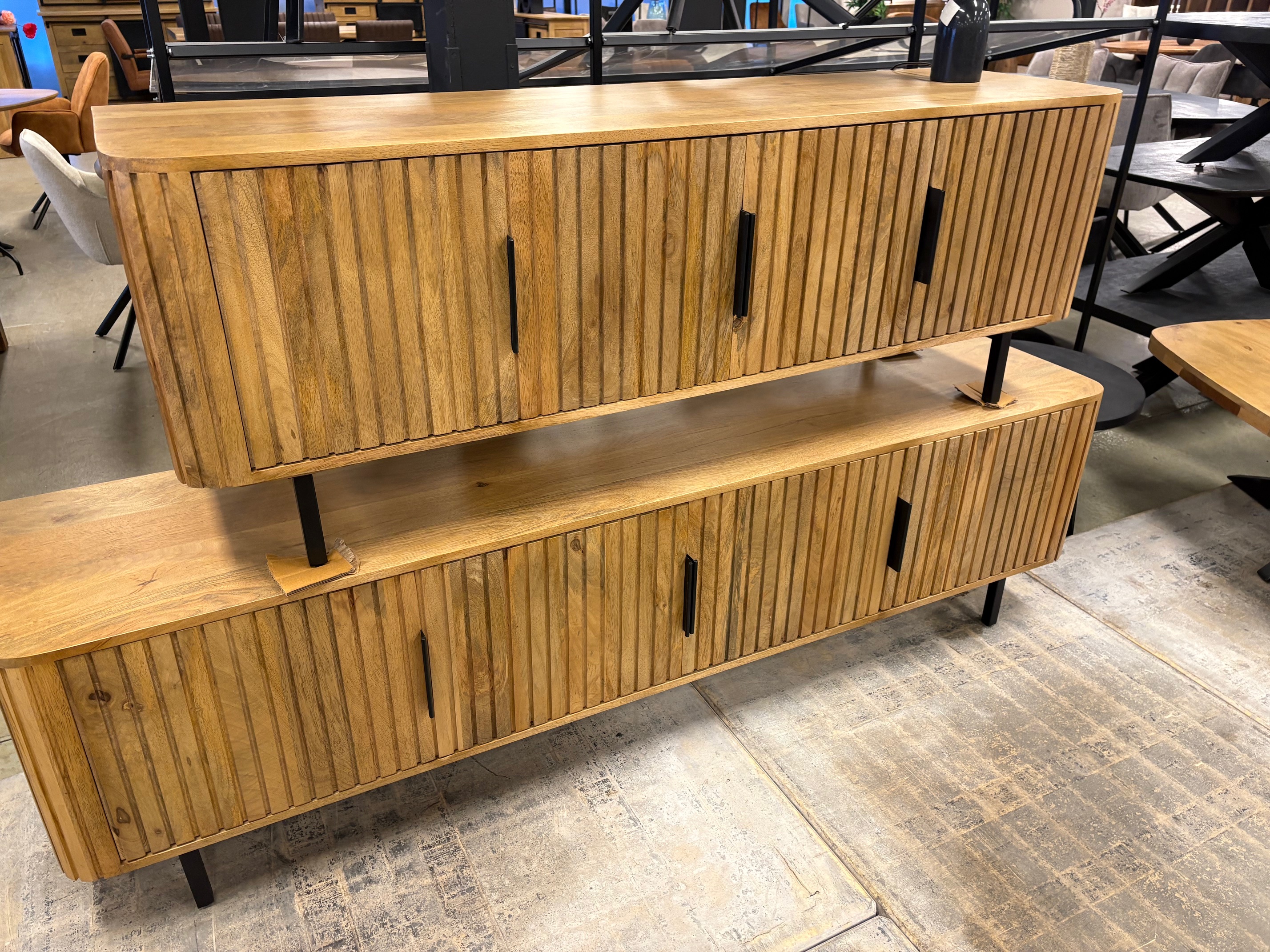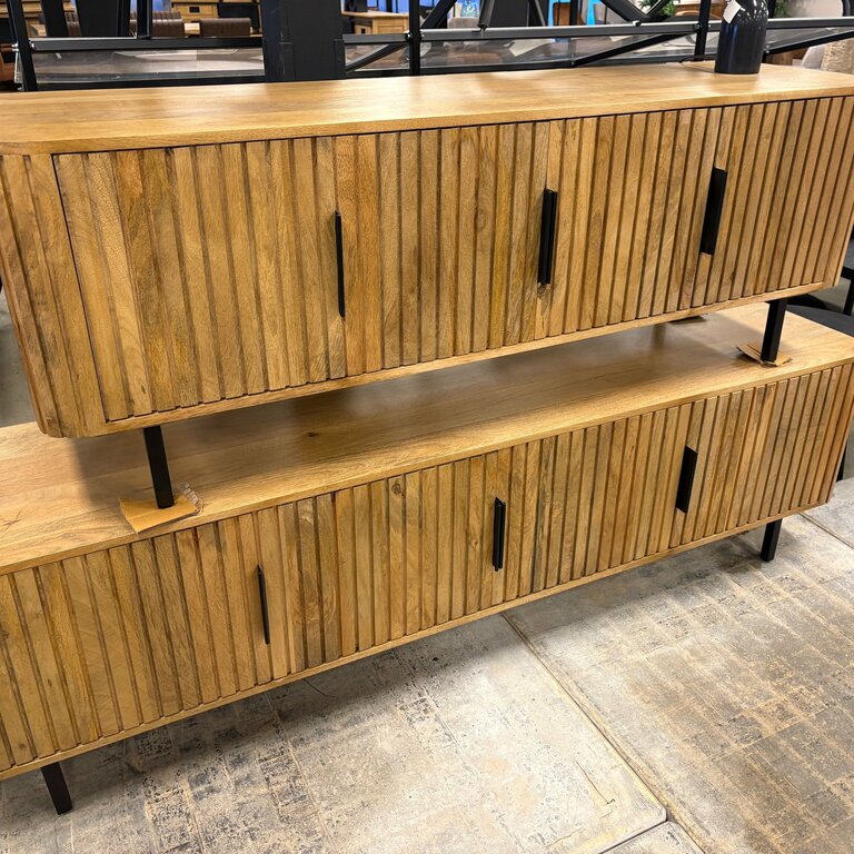 Ses façades en manguier à rainures verticales et ses pieds en métal noir apportent caractère et élégance à votre salon. Fonctionnel, il offre de beaux espaces de rangement fermés pour un intérieur ordonné.