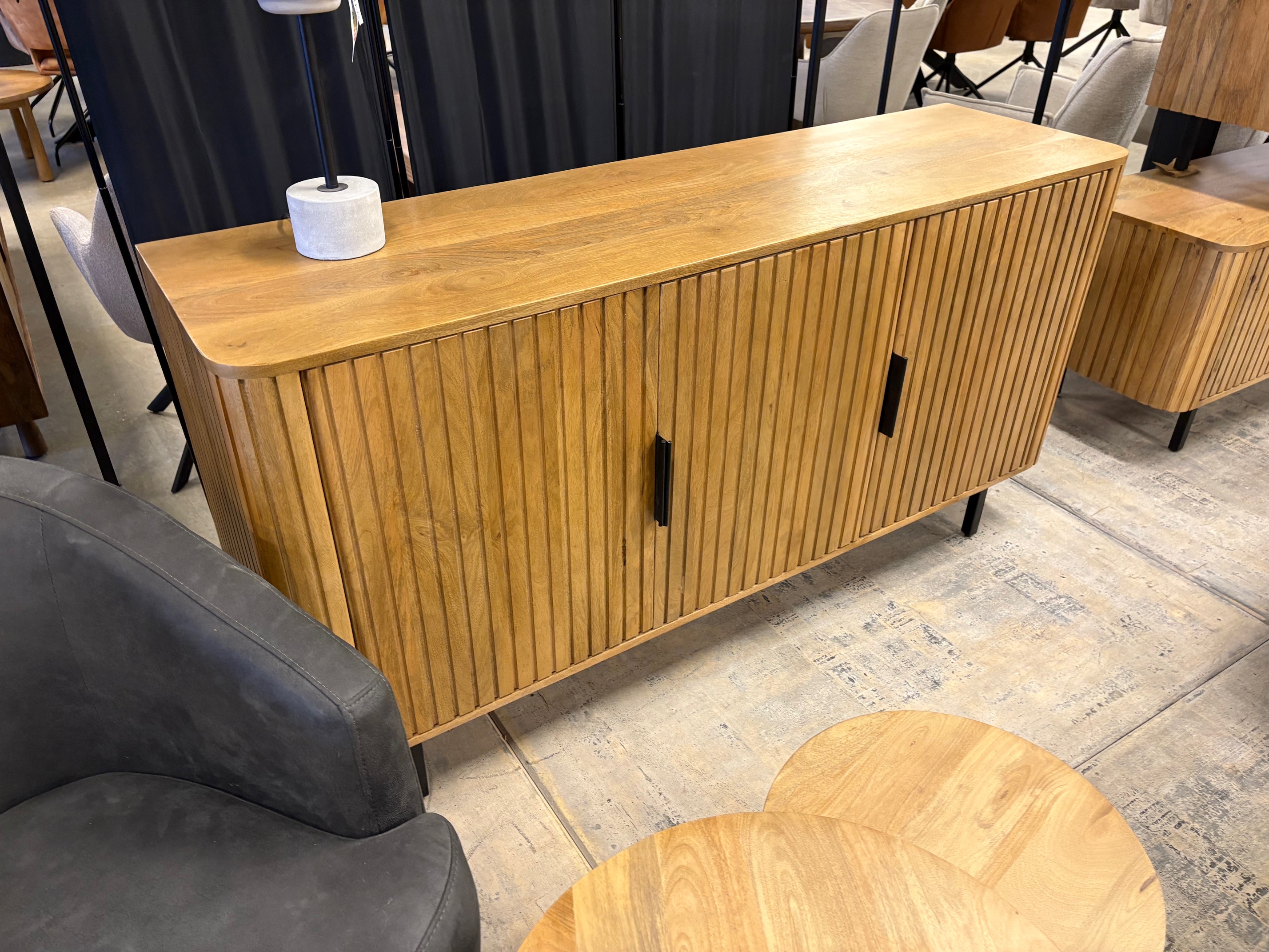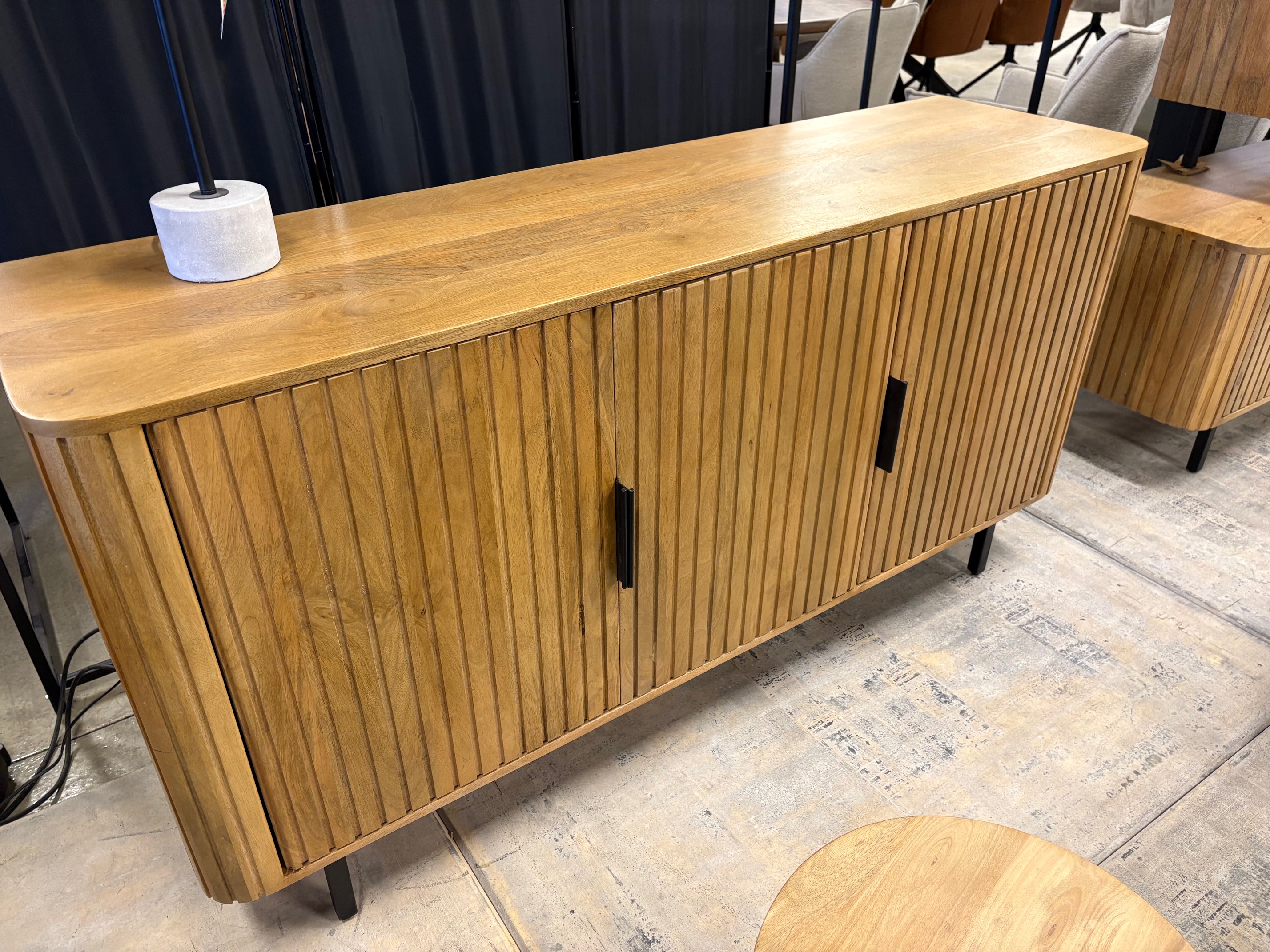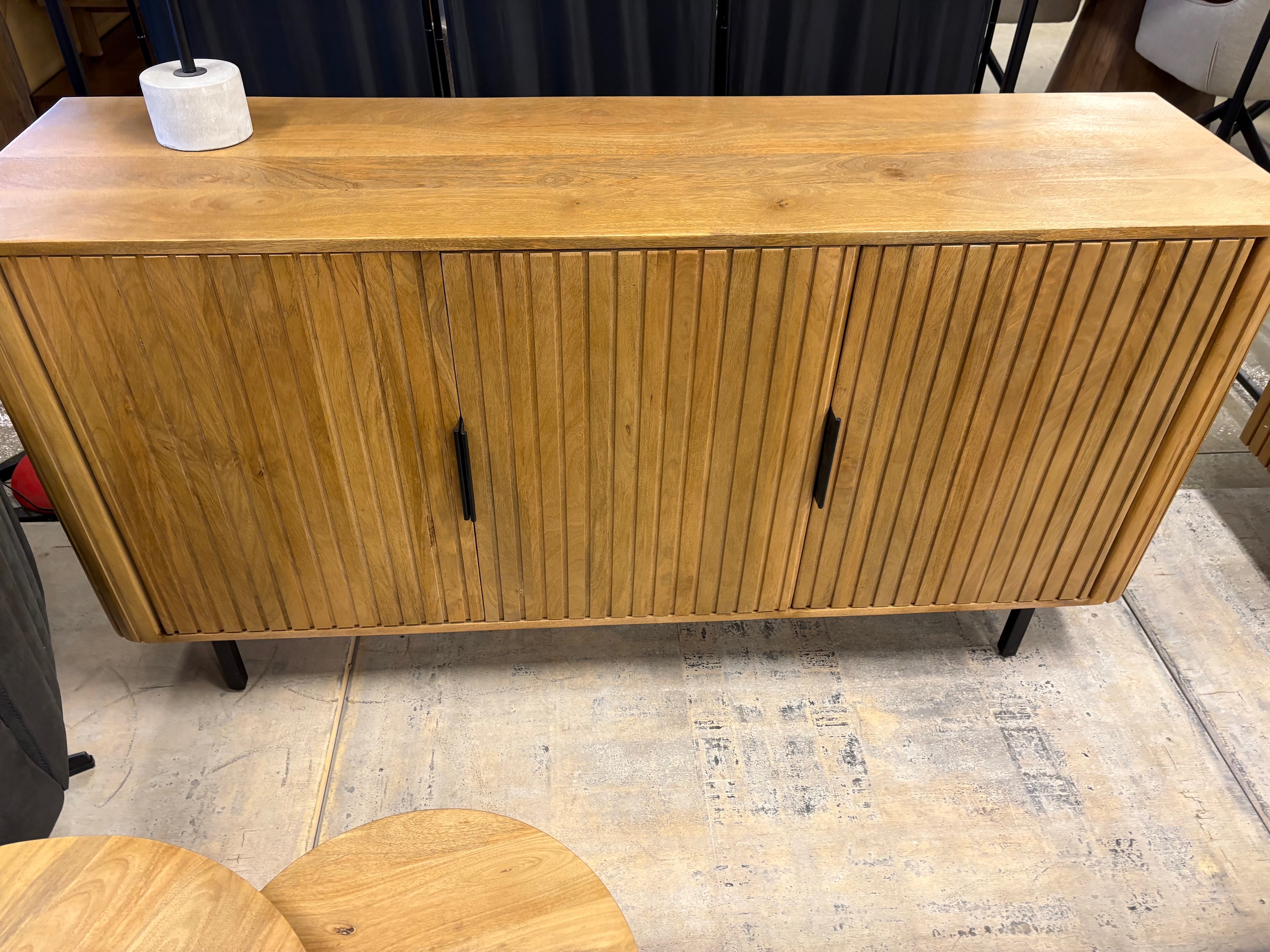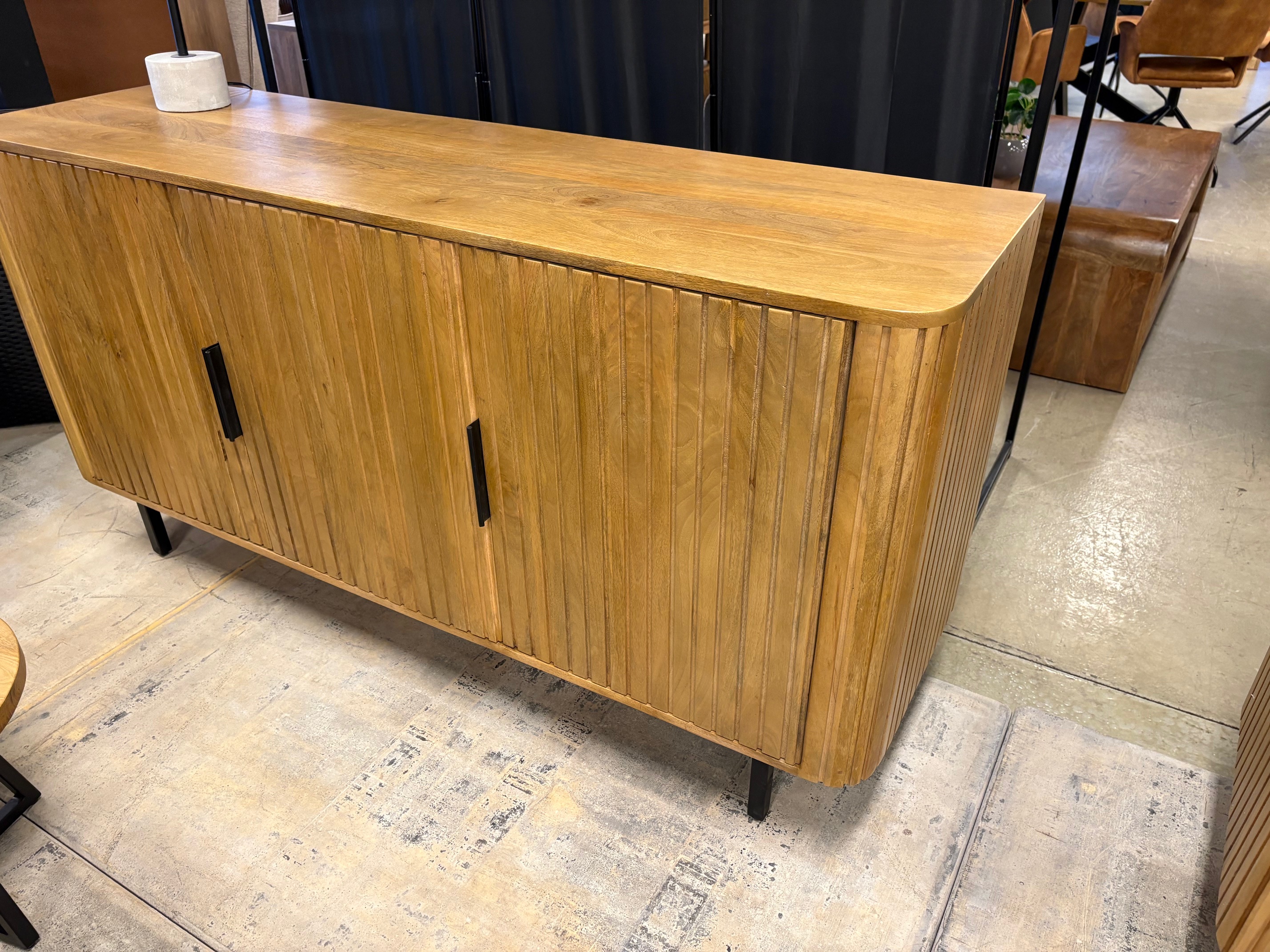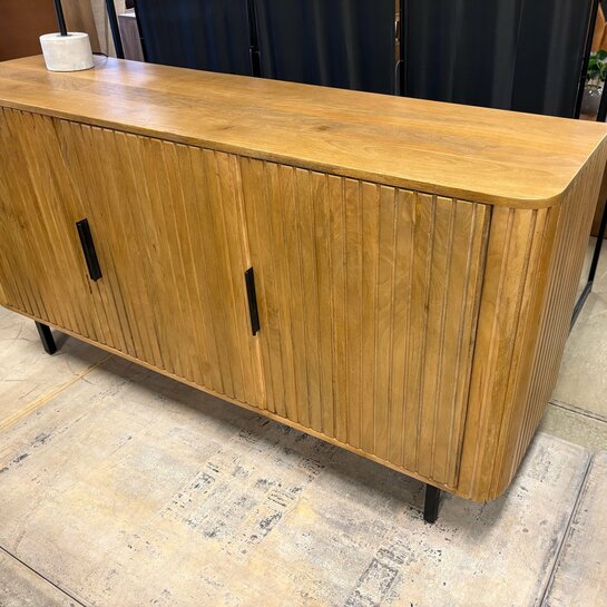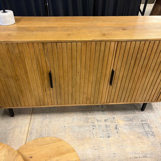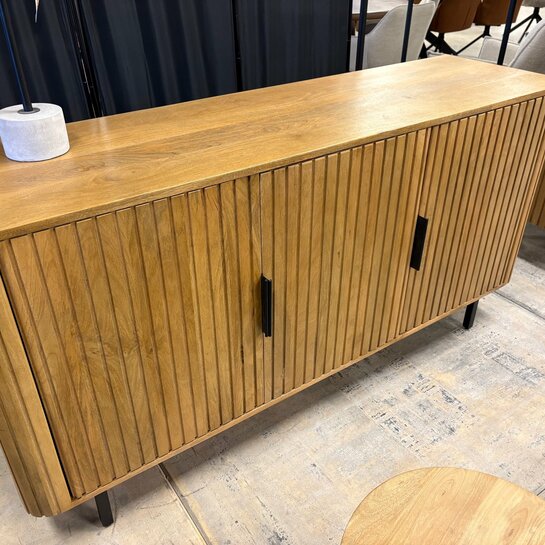 Ses façades rainurées verticales et ses pieds en métal noir apportent caractère et élégance à votre intérieur. Fonctionnelle, elle offre de beaux espaces de rangement fermés pour un séjour organisé.