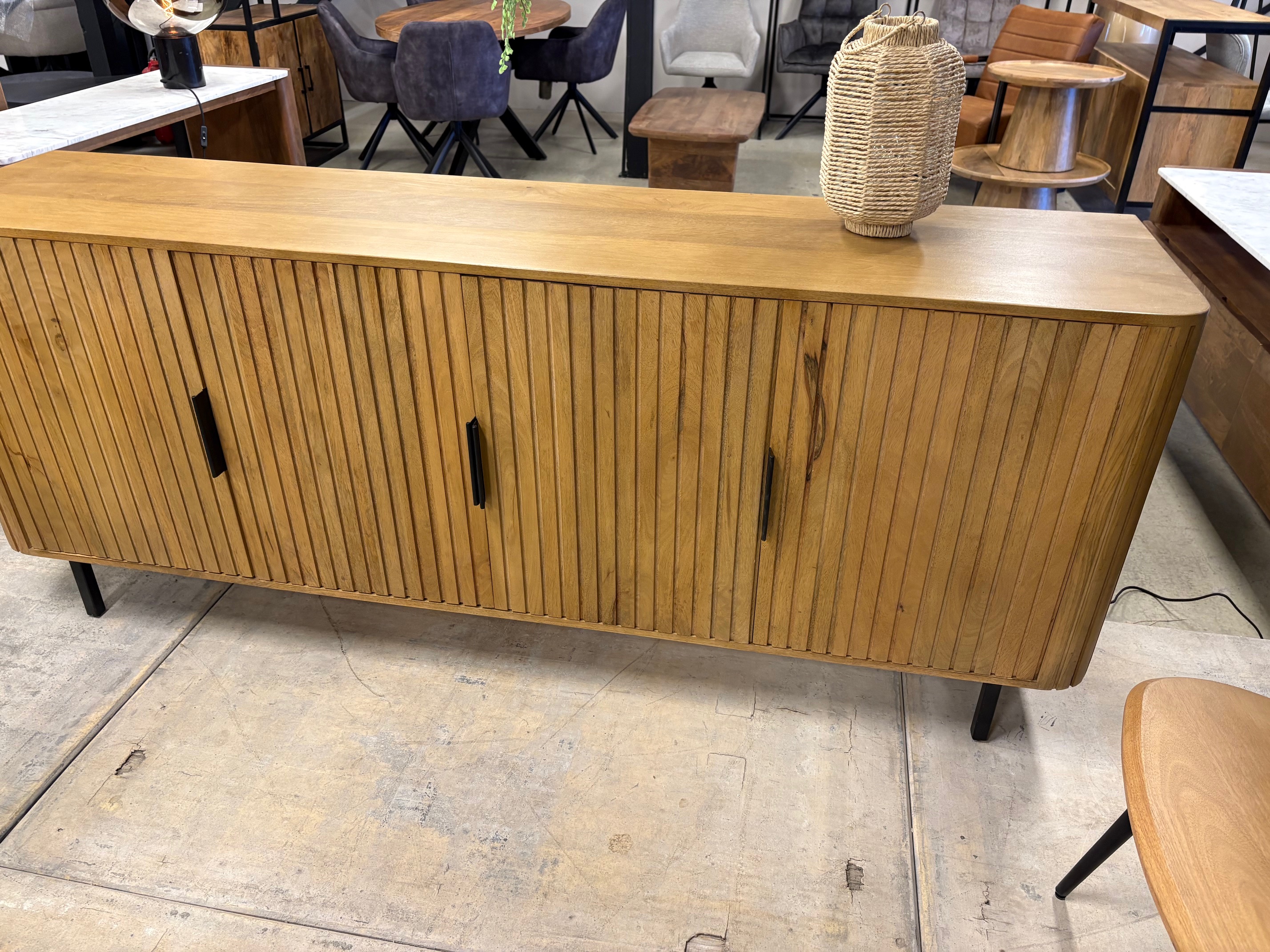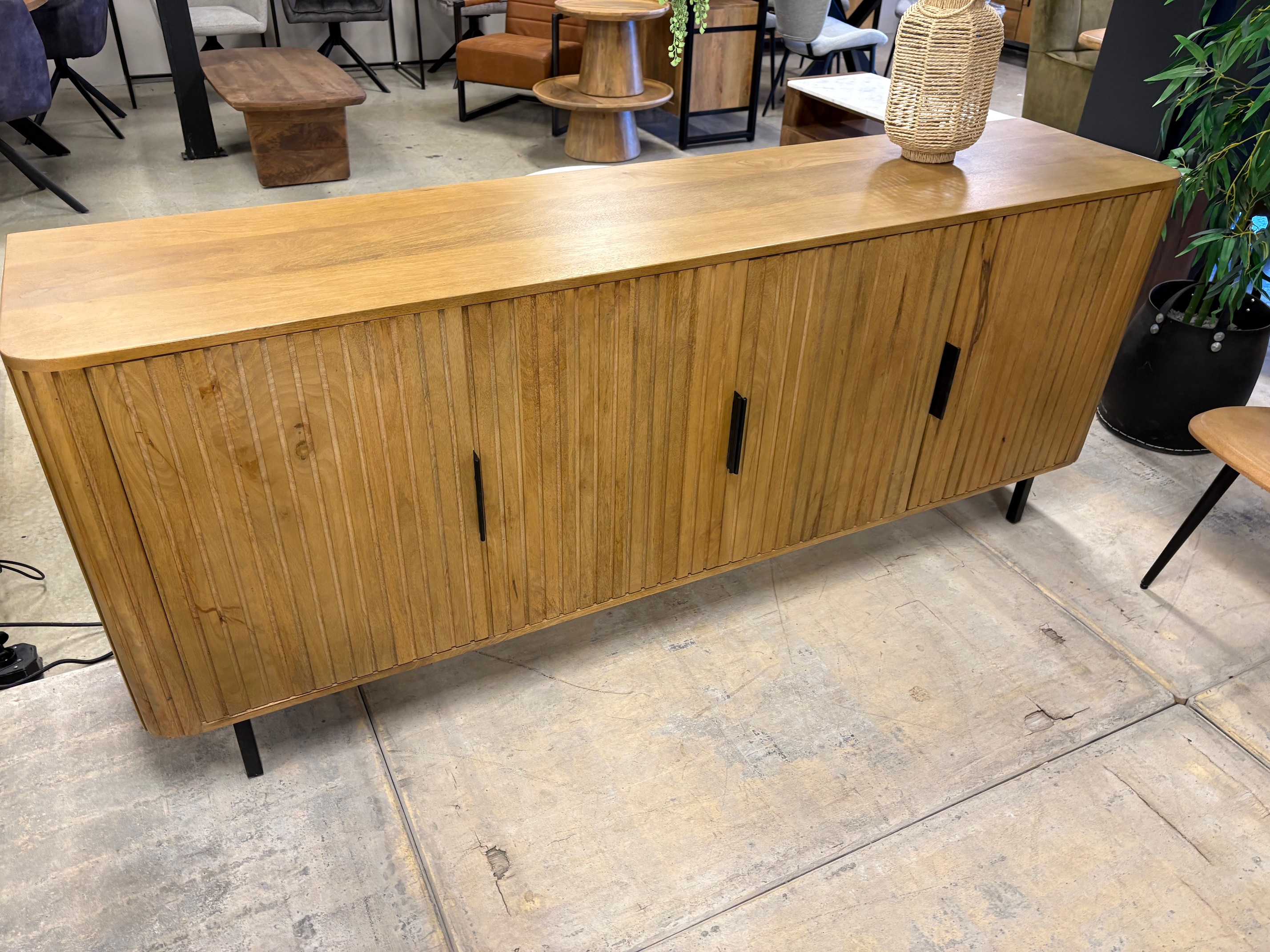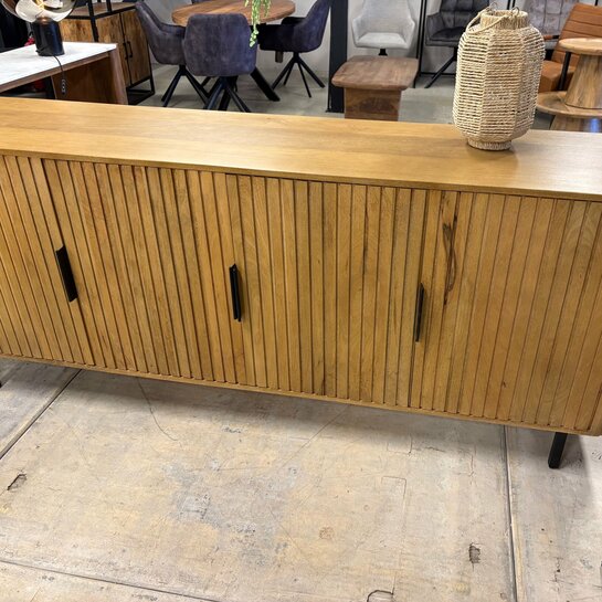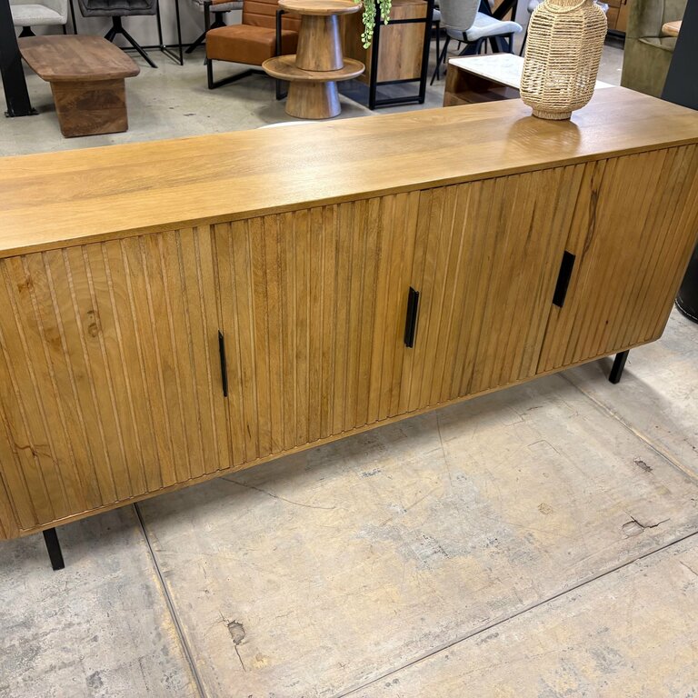 L’enfilade Irène 200 s’inscrit dans la même collection que le modèle Irène 160, tout en offrant un format plus généreux. Conçue en manguier, elle associe la chaleur du bois naturel à un design contemporain, avec des façades rainurées qui apportent relief et élégance à votre intérieur.