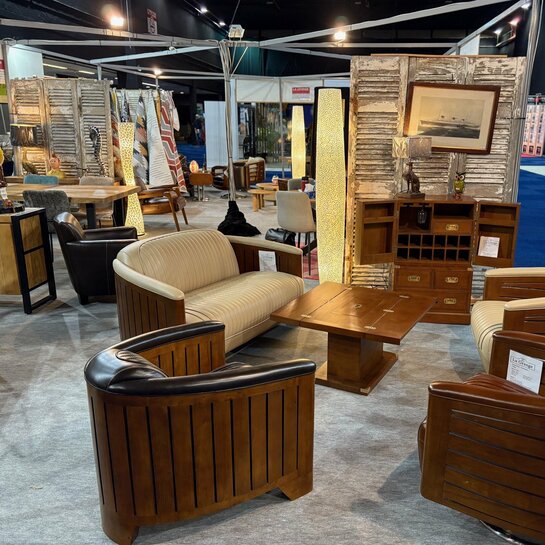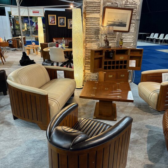 Composez votre ensemble : Table basse Riva, Concorde (grand), Sylvain Binet - Singe Chewing Gum, Bateau Riva, Fauteuil Paquebot Yacht club chocolat, Fauteuil club Commodore marron vintage, Fauteuil club Commodore ivoire, Table basse marine Newport à rabats, Bar marine Newport
