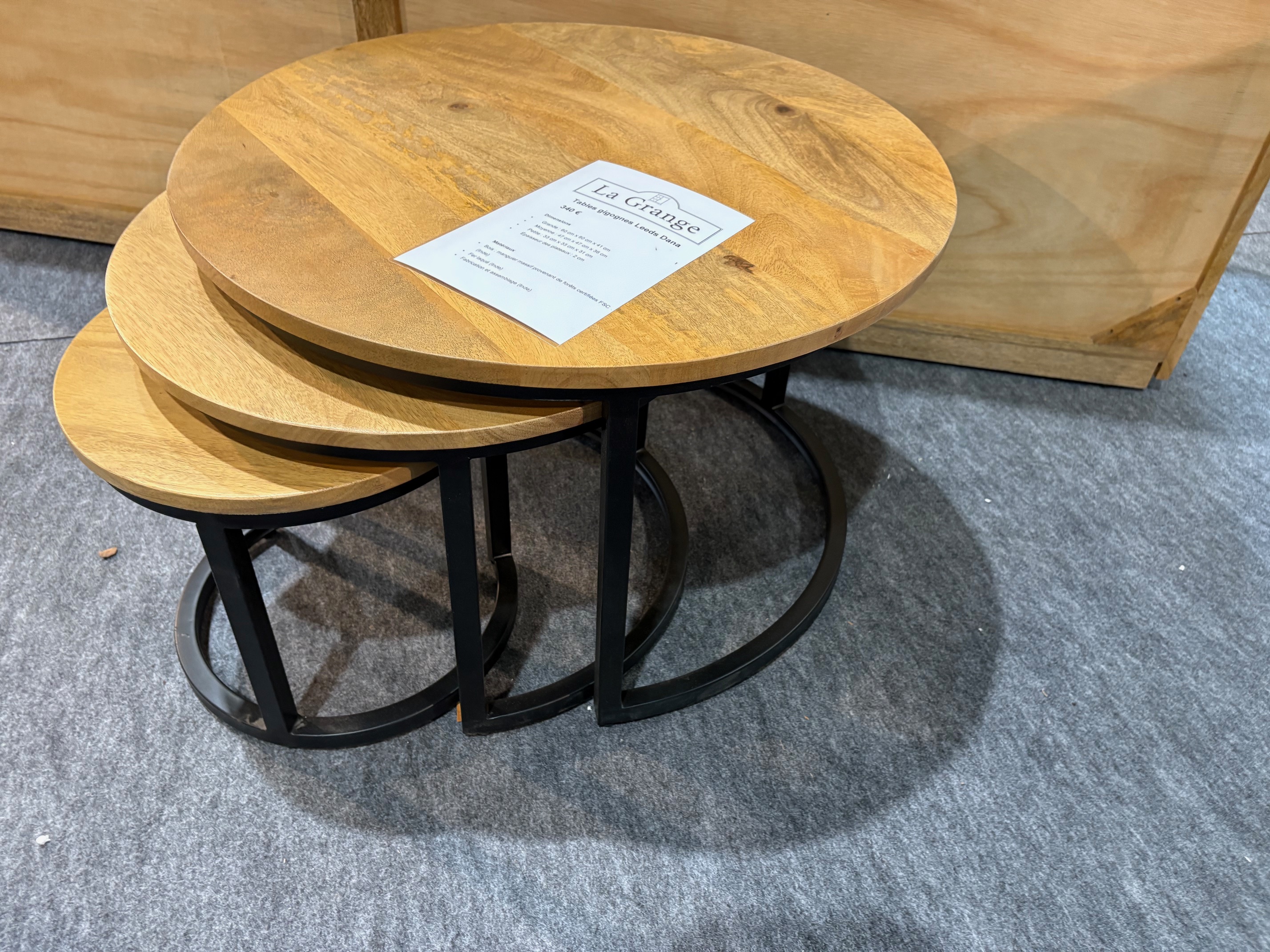 Tables de salon, armatures en fer et plateaux bois (manguier).