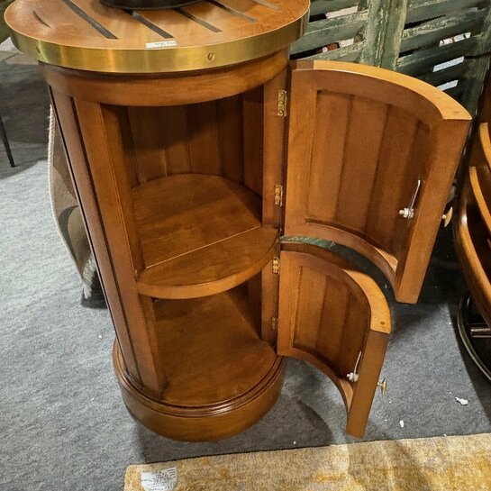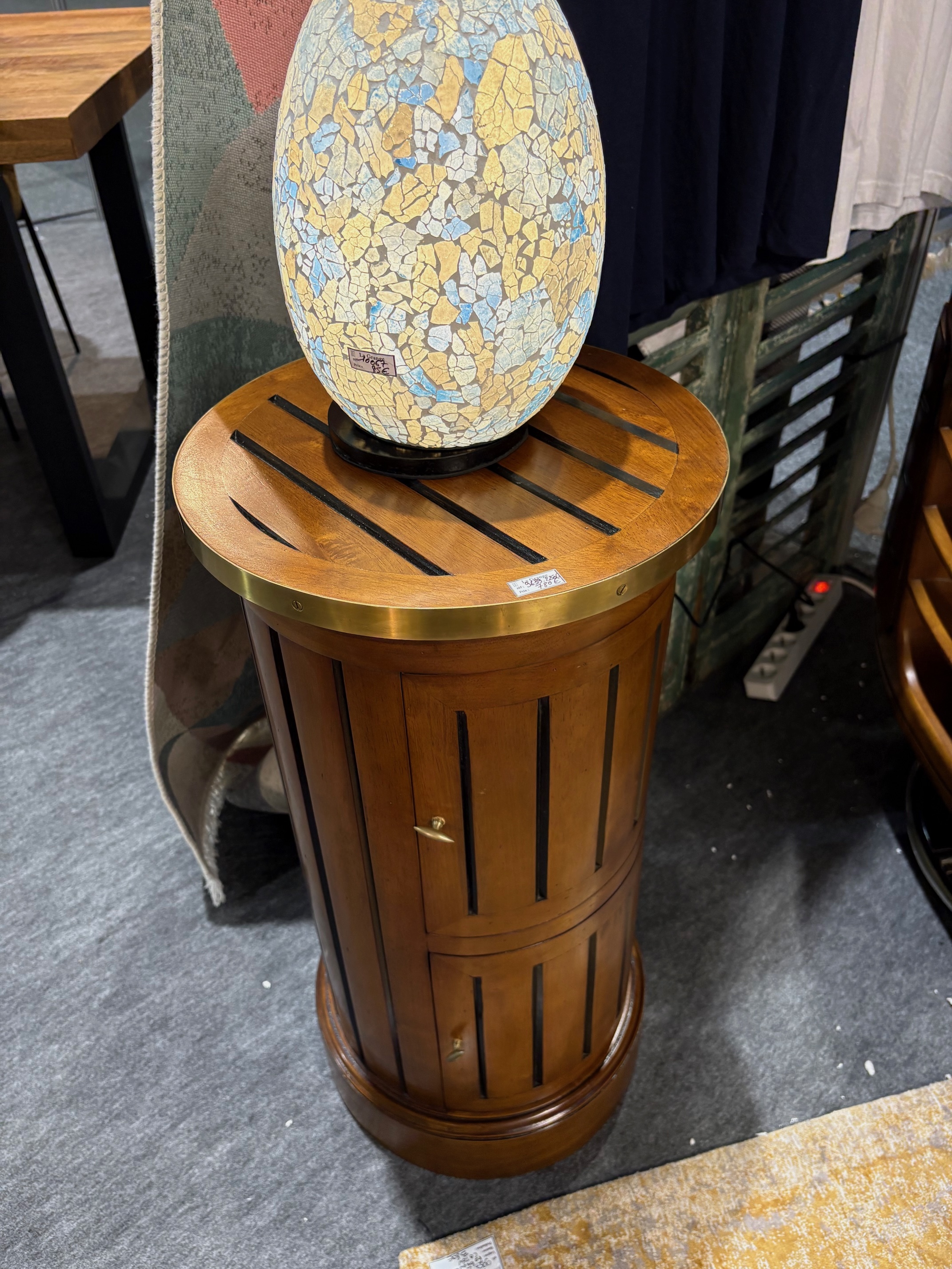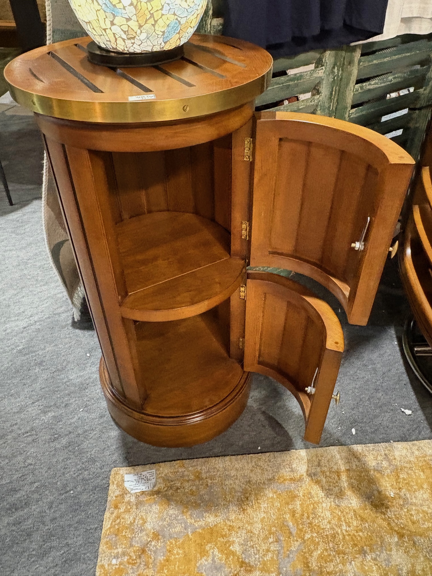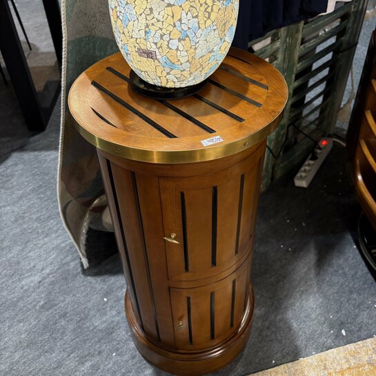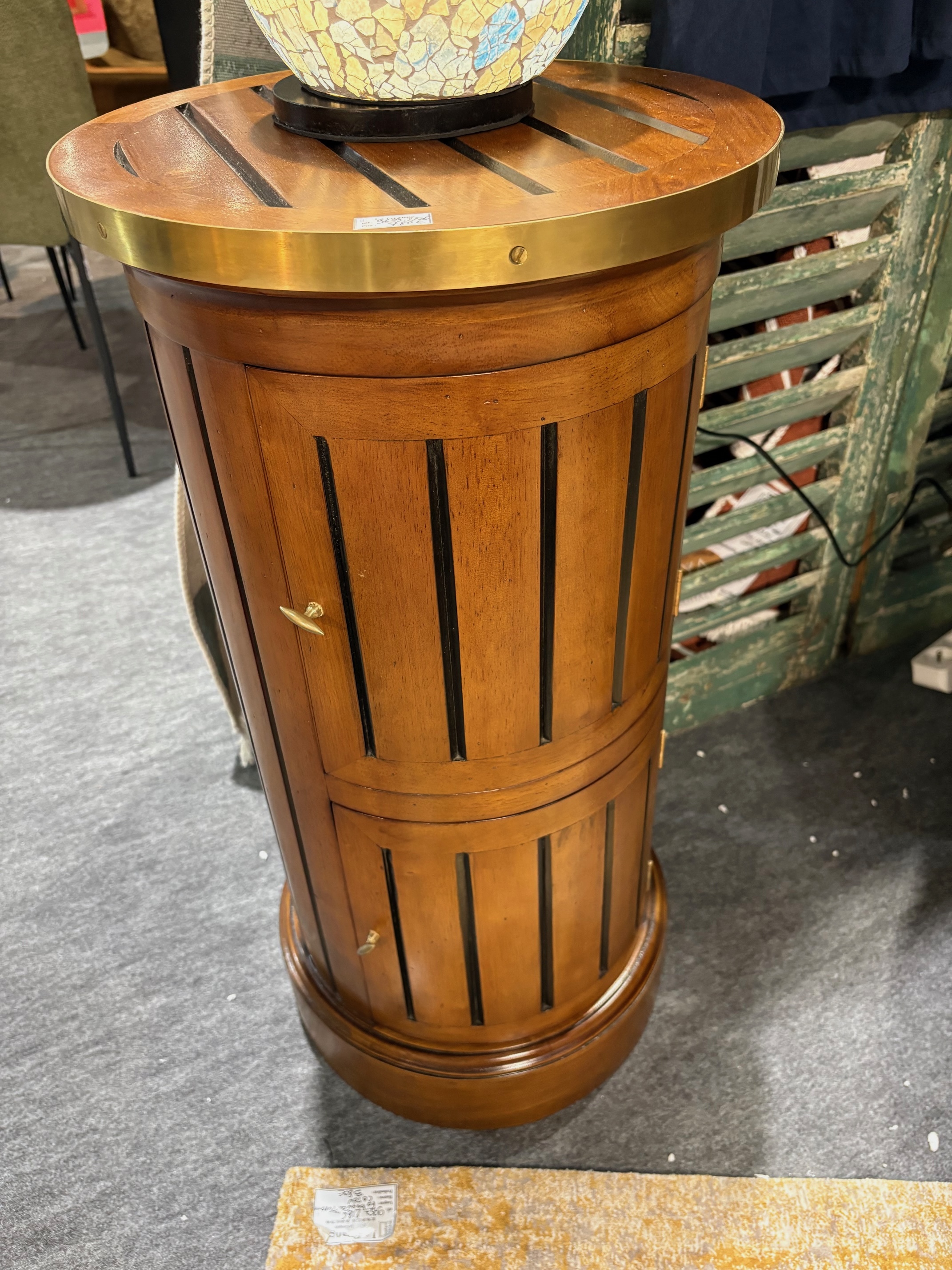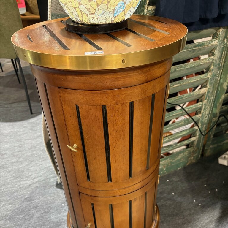 Sa silhouette cylindrique habillée de lattes de bois verticales évoque les cabines des navires transatlantiques. La finition vernie teinte noyer, la patine marron foncé et les détails en laiton (poignées, cerclage et charnières) soulignent son style raffiné.