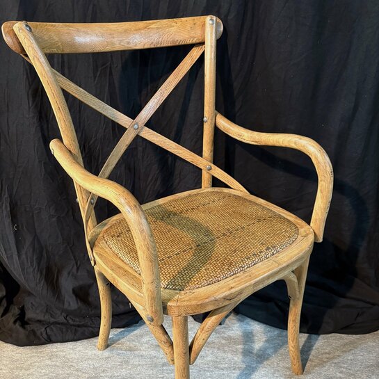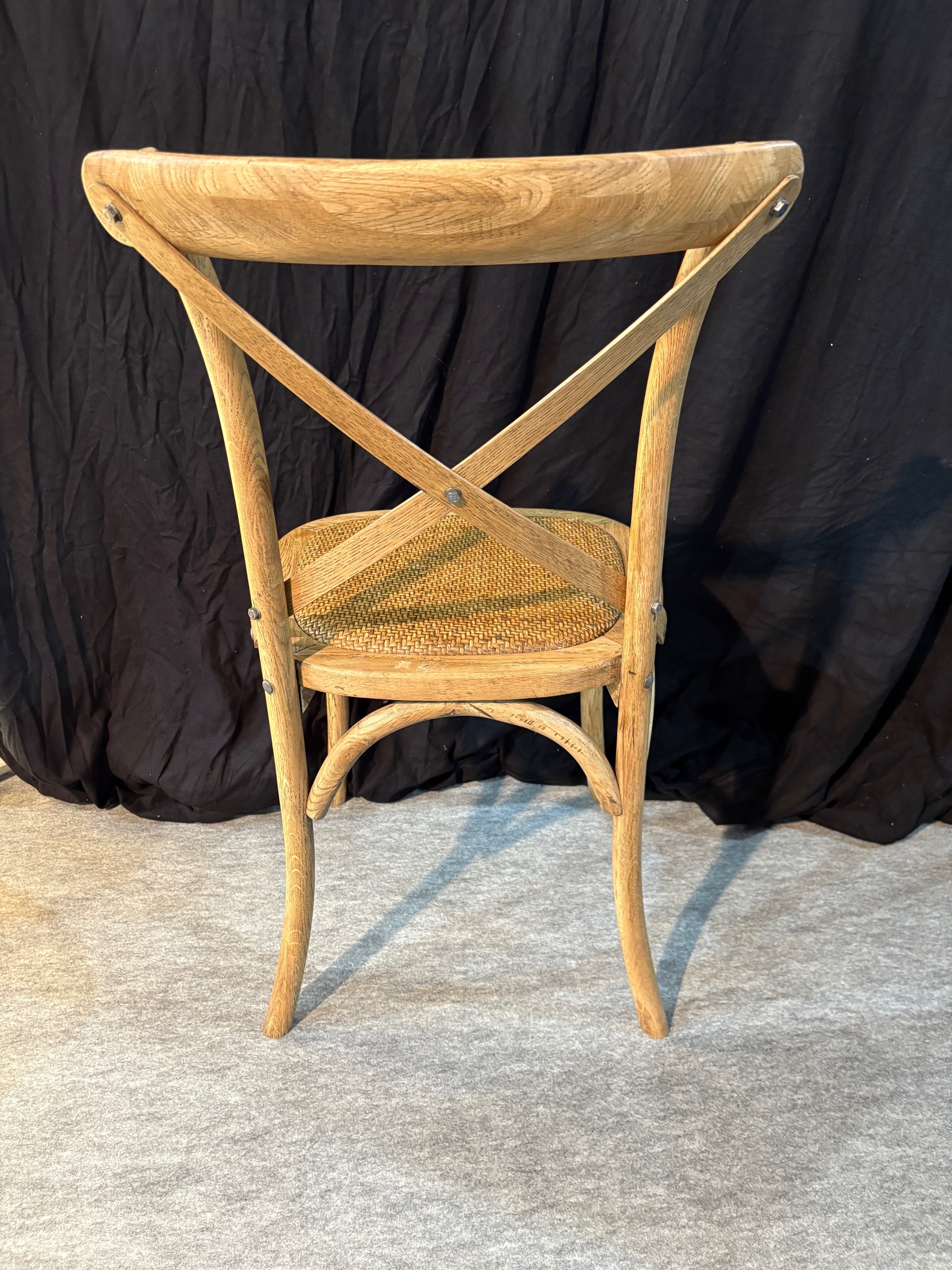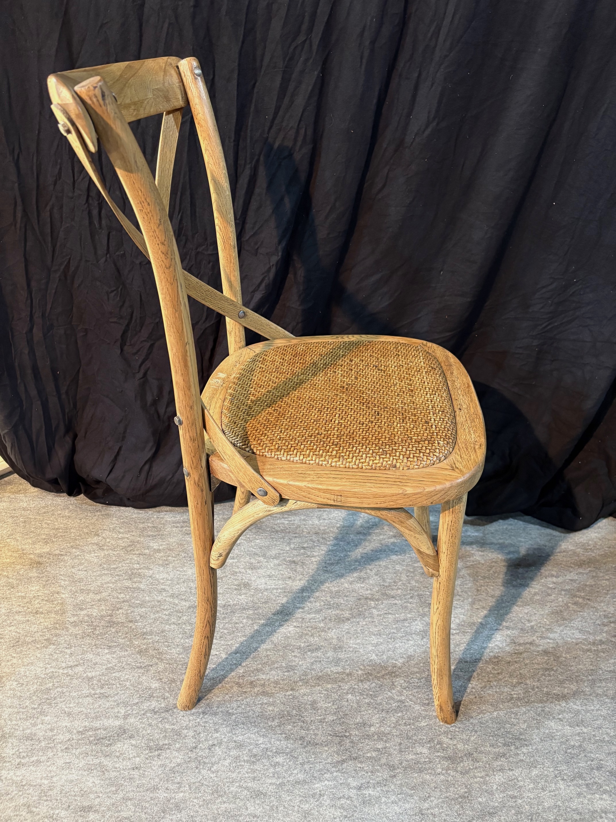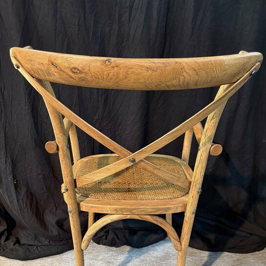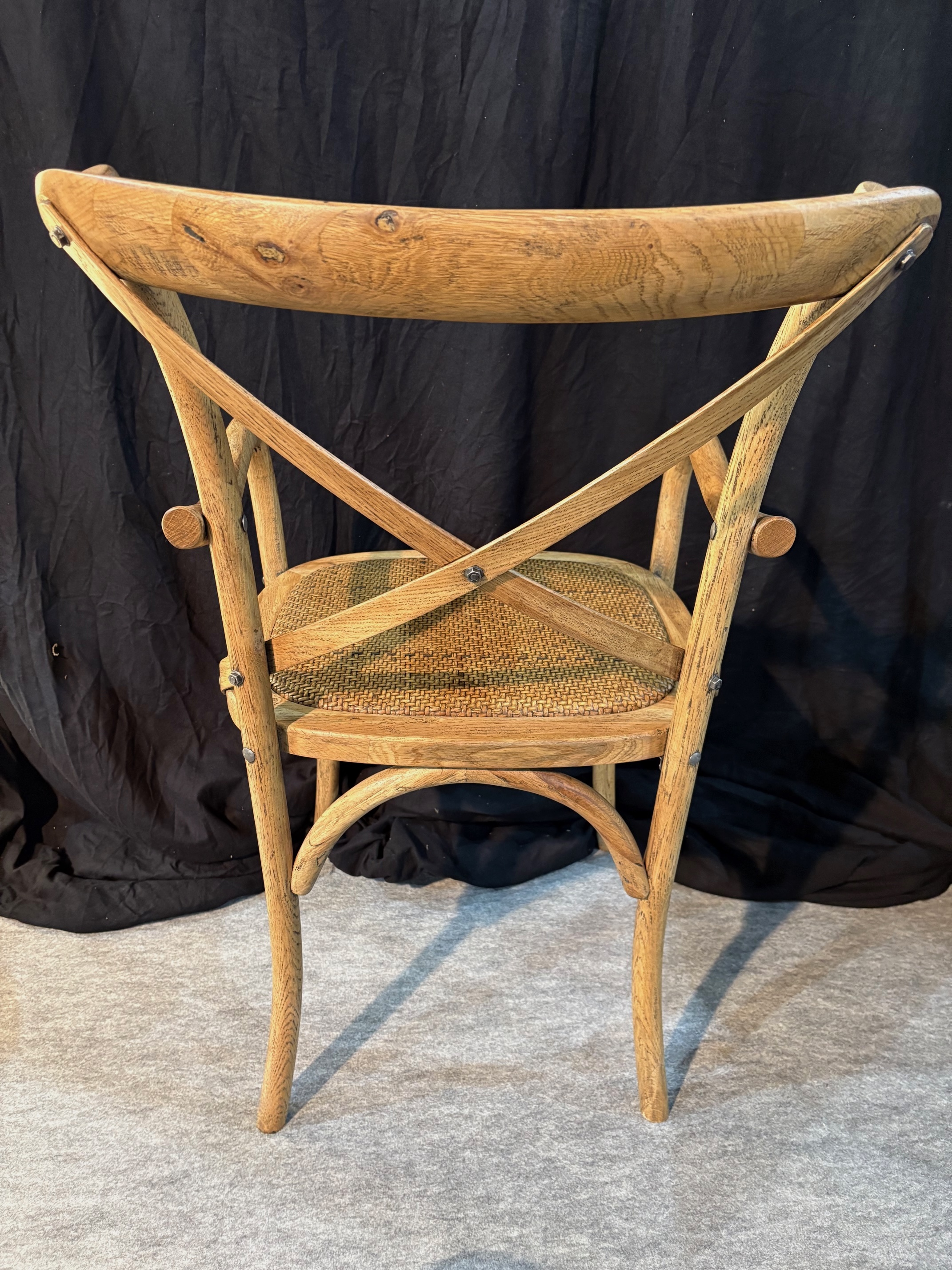 Cette chaise de bistrot est un bel exemple de mobilier élégant et robuste, réalisé en chêne massif. Le bois tourné, qui compose les pieds et le dossier de la chaise, lui confère une esthétique classique et une grande solidité. L’aspect naturel du chêne est mis en valeur par une finition légèrement patinée qui donne à la chaise un charme intemporel.
