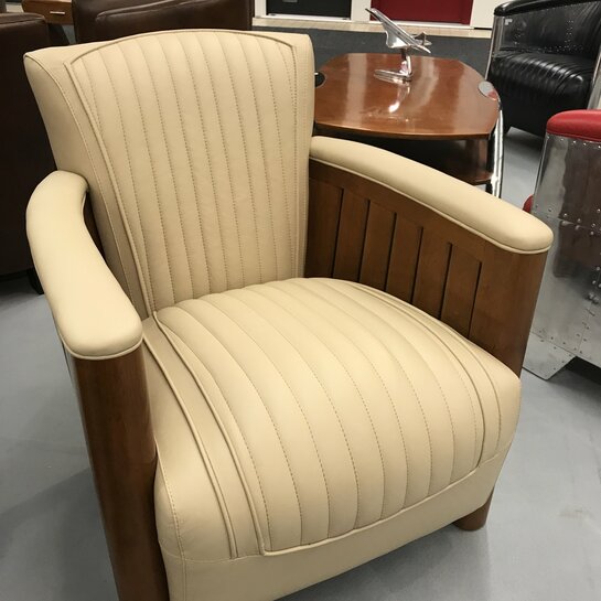 Fauteuil très confortable et peu encombrant. Sa finition en bois massif et cuir « pleine fleur » rappelle l’épopée des transatlantiques de luxe.